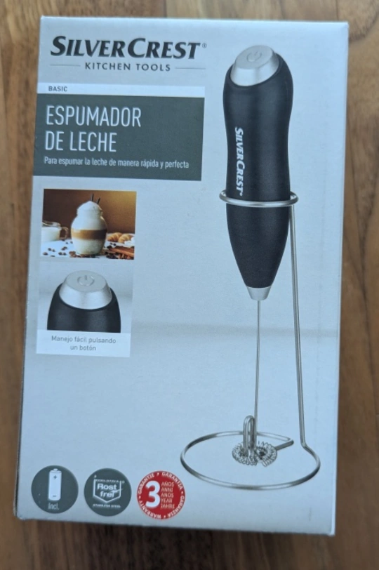 Brand new, in sealed box SilverCrest milk frother. Perfect froth in no time. Easy to use. Whisk made from stainless steel. Comfortable ergonomic design. Includes stand and 2x 1.5V AA batteries.