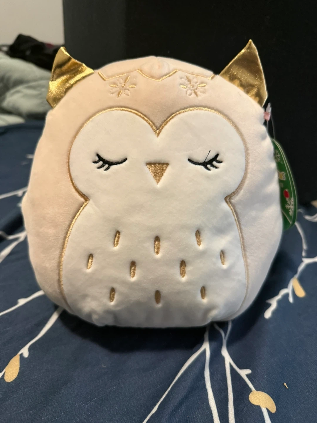 This is a super soft Squishmallow owl plush toy. It's a pale pink colour with gold accents on its ears and belly. The embroidered details give it a cute, sleepy face. It's the perfect size for cuddles!