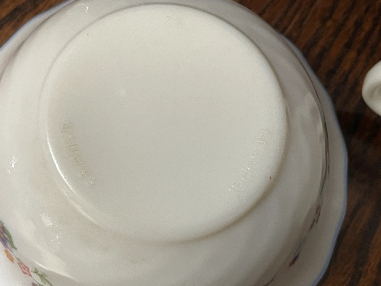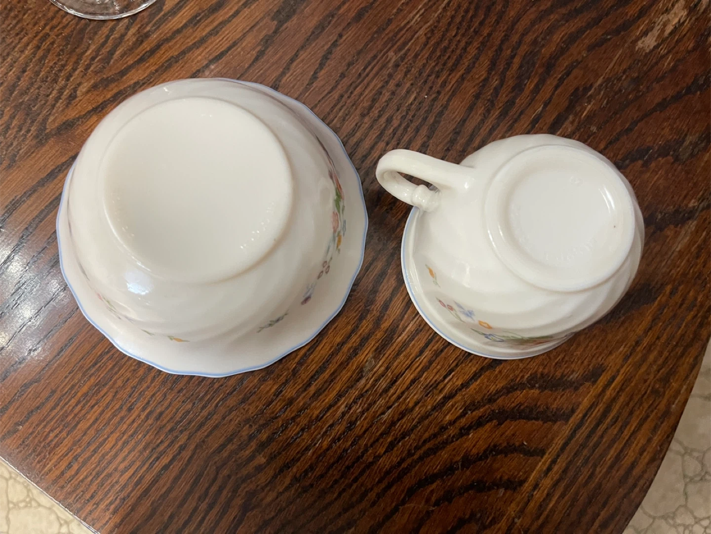 Lovely floral patterned Opal glass cup and matching bowl from Luminarc, made in France. A clear glass wine goblet with a coordinating floral design is also included. These pieces are perfect for a charming tea setting or for serving desserts!