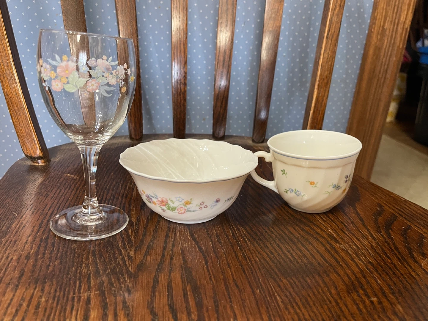 Lovely floral patterned Opal glass cup and matching bowl from Luminarc, made in France. A clear glass wine goblet with a coordinating floral design is also included. These pieces are perfect for a charming tea setting or for serving desserts!
