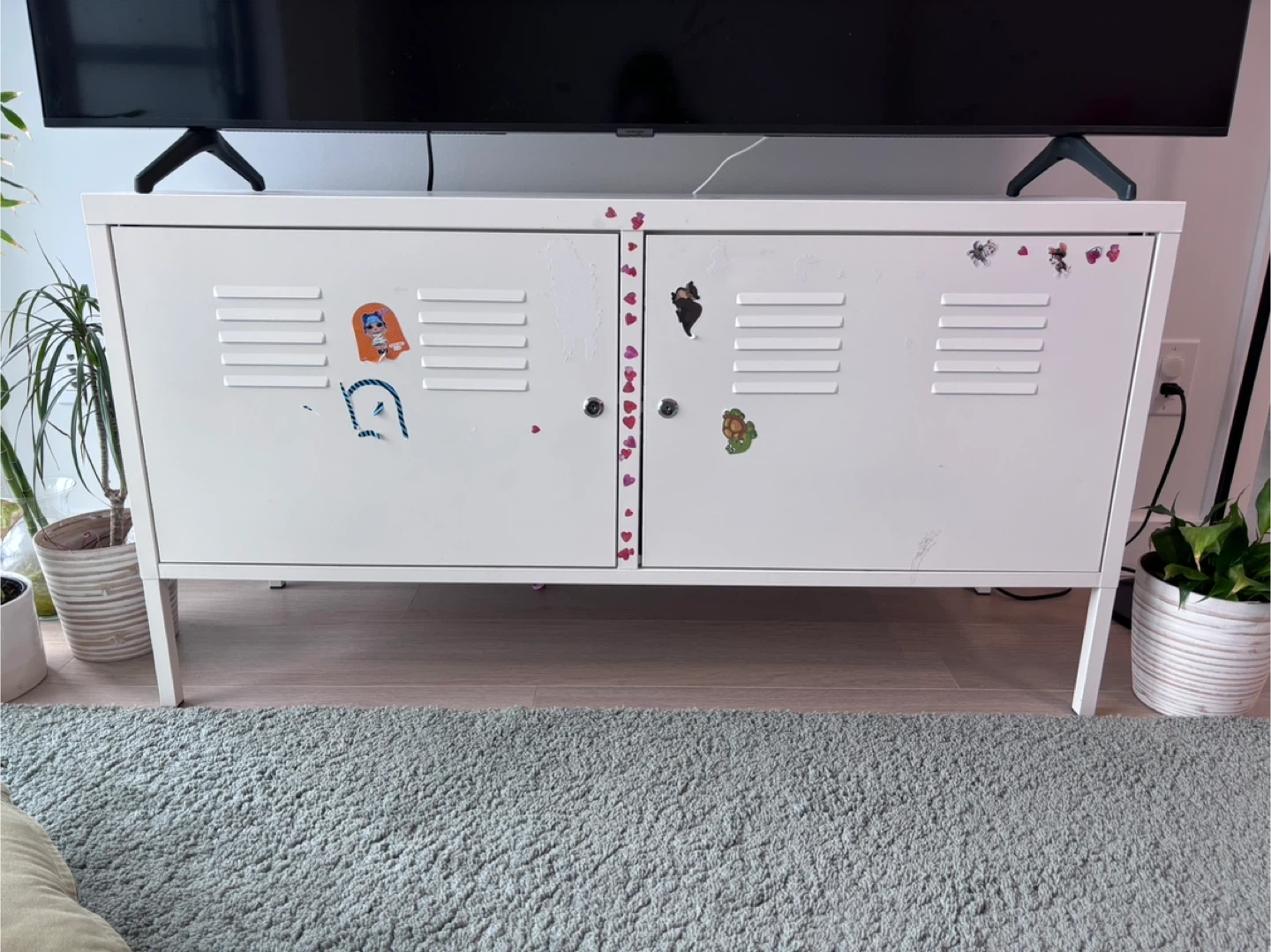 This white two-door cabinet features a locker-style design with slatted doors. It's perfect for storing various items. The cabinet has a metal construction and sits on angled legs.