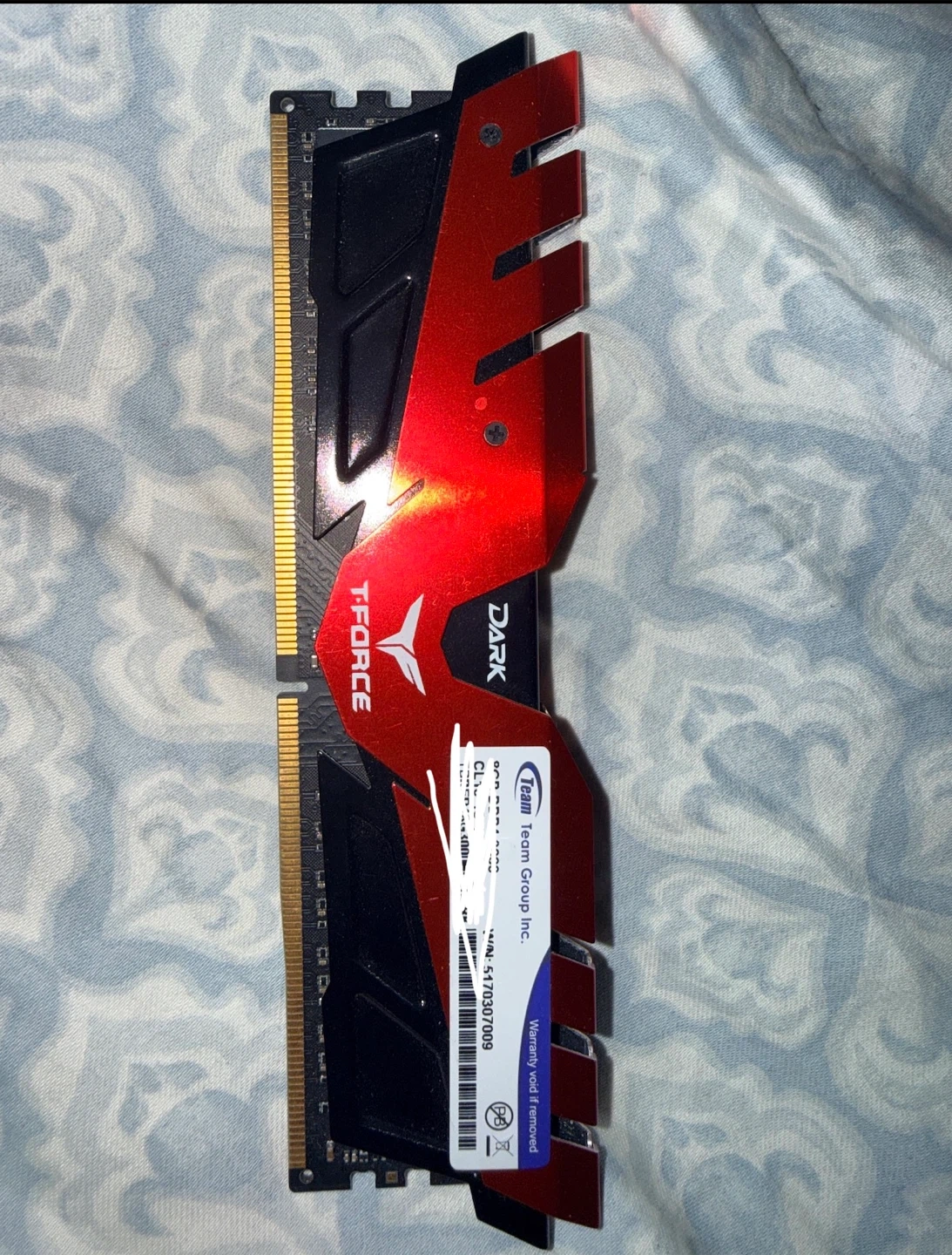 This is a Team T-Force DARK DDR4 RAM module. It has a distinctive red and black heat spreader. The module comes from Team Group Inc. It's a component for computers.