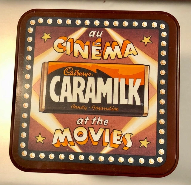 Vintage 1970s Cadbury Caramilk tin box, movie theme, collector's item with a hinged lid. This is a pop culture collectible. Available for pickup in the Bridgeland area. Cash and cashless payments are accepted.