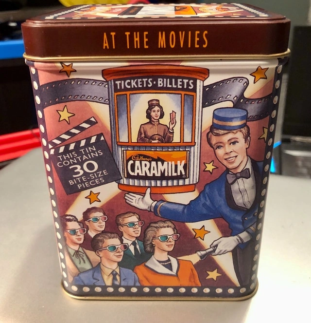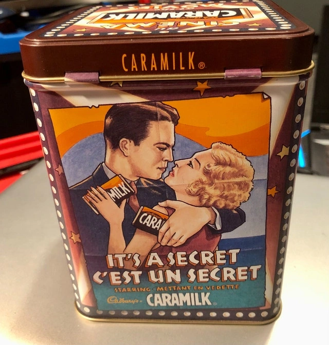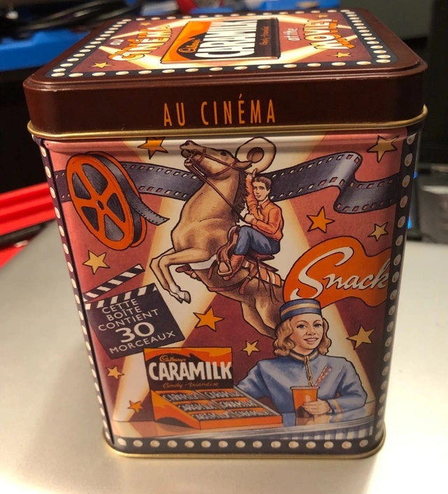 Vintage 1970s Cadbury Caramilk tin box, movie theme, collector's item with a hinged lid. This is a pop culture collectible. Available for pickup in the Bridgeland area. Cash and cashless payments are accepted.
