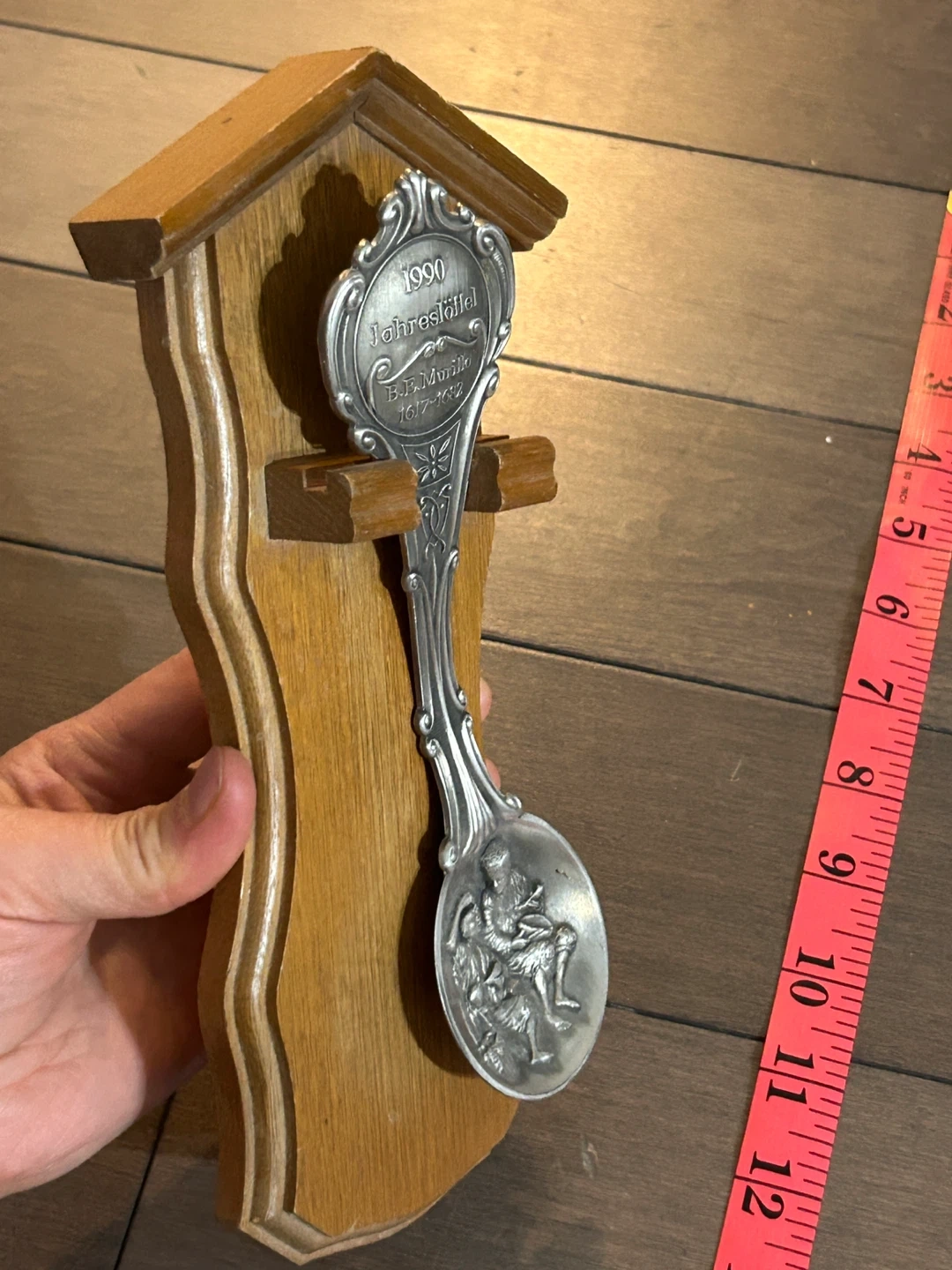 This is a commemorative 1990 anniversary spoon, marked 'Jahrestöffel'. It's mounted on a wooden display with a quaint depiction of two people on the spoon's bowl. The spoon itself is intricately detailed, featuring German text around its head.