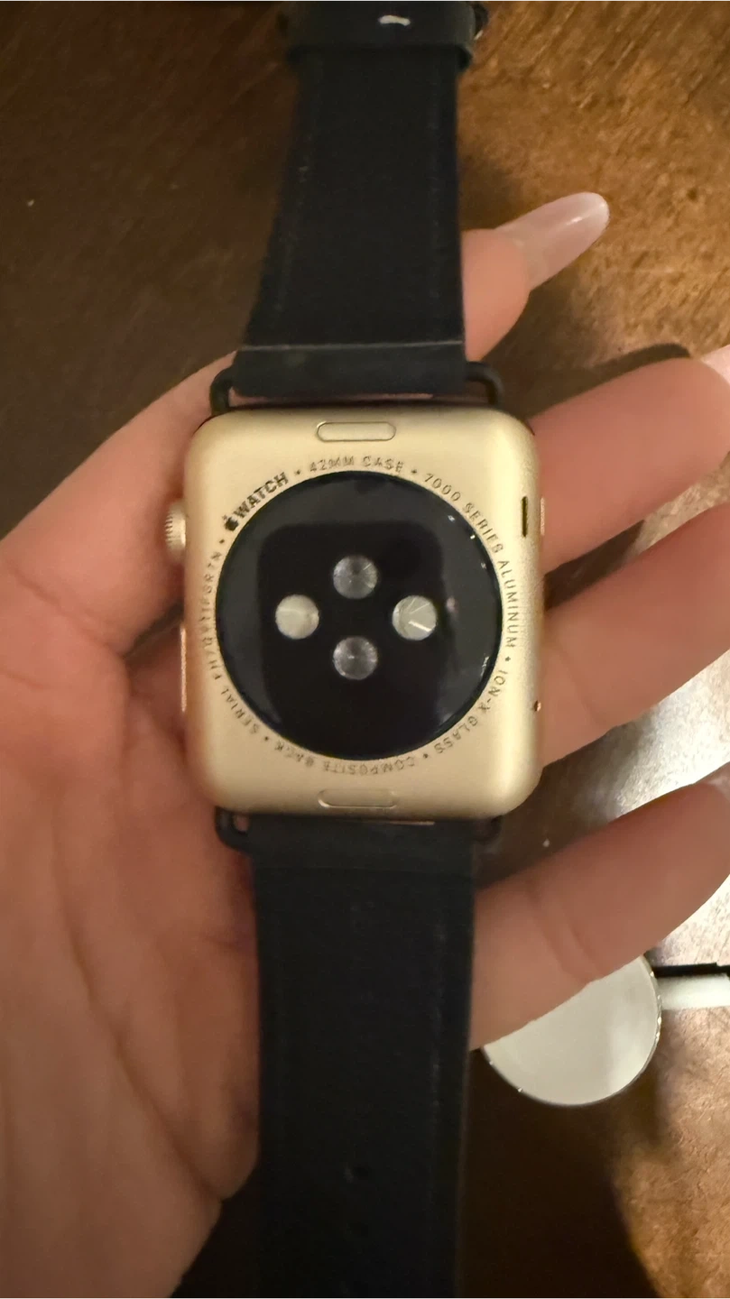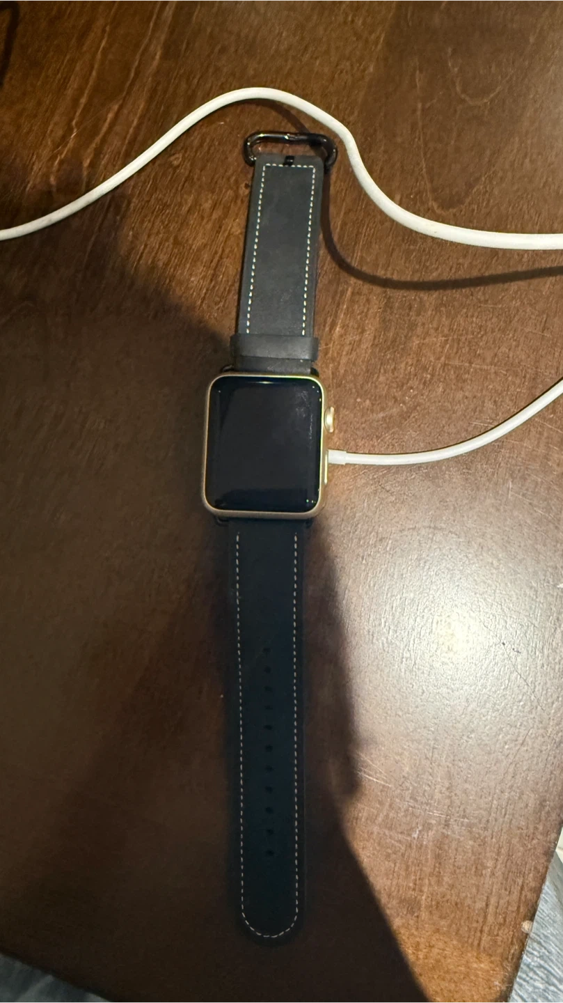This is an Apple Watch Series 2 with a 42mm gold aluminum case. It features a Ion-X Glass display and a composite back. The watch comes with a black band. It's a great device for tracking fitness and staying connected.
