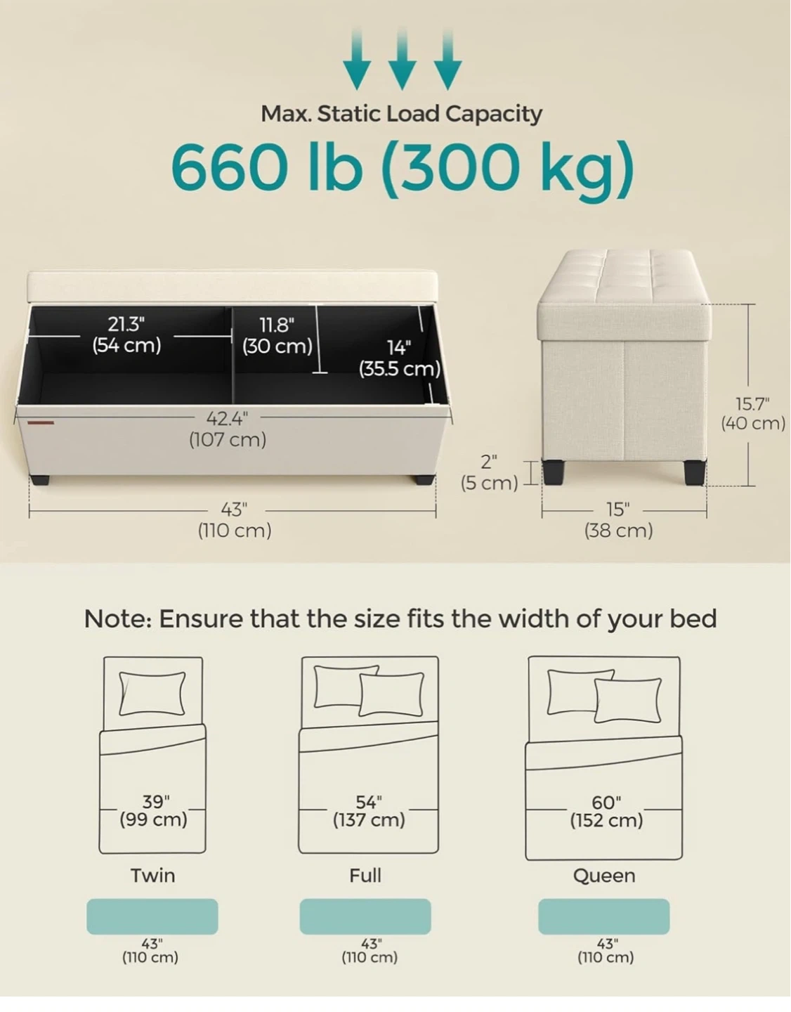 This SONGMICS storage ottoman bench is a versatile piece for your home. It offers a generous storage capacity with dimensions of 43" (110 cm) in length and 15.7" (40 cm) in height. It's built to hold up to 660 lb (300 kg) of static load capacity. Use it for extra seating or to keep blankets and other items tidy!