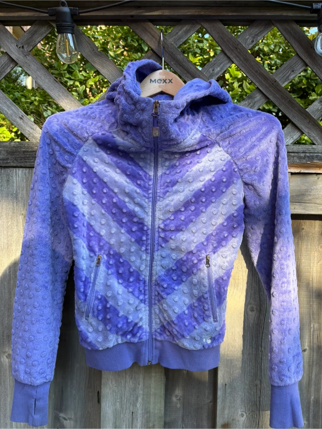 Cozy up in this purple fuzzy zip-up hoodie! It has a unique textured design and a comfortable fit, perfect for cooler days. It's in great condition and ready for a new home