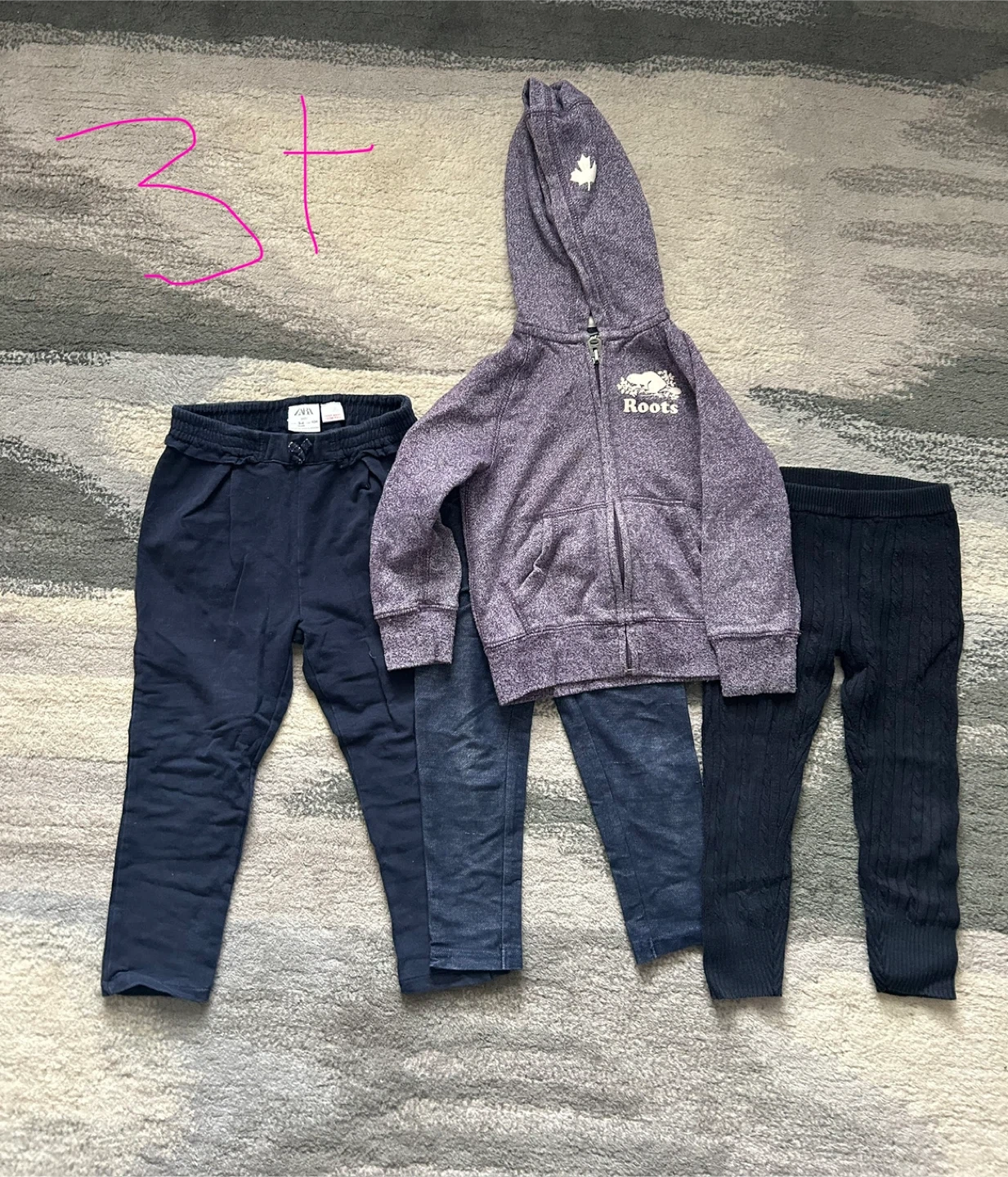 This is a cute three-piece set for a child, featuring a purple Roots zip-up hoodie with a maple leaf emblem and a white Roots logo. It's paired with two pairs of navy blue pants, one from Zara. The set is sized for 3T.