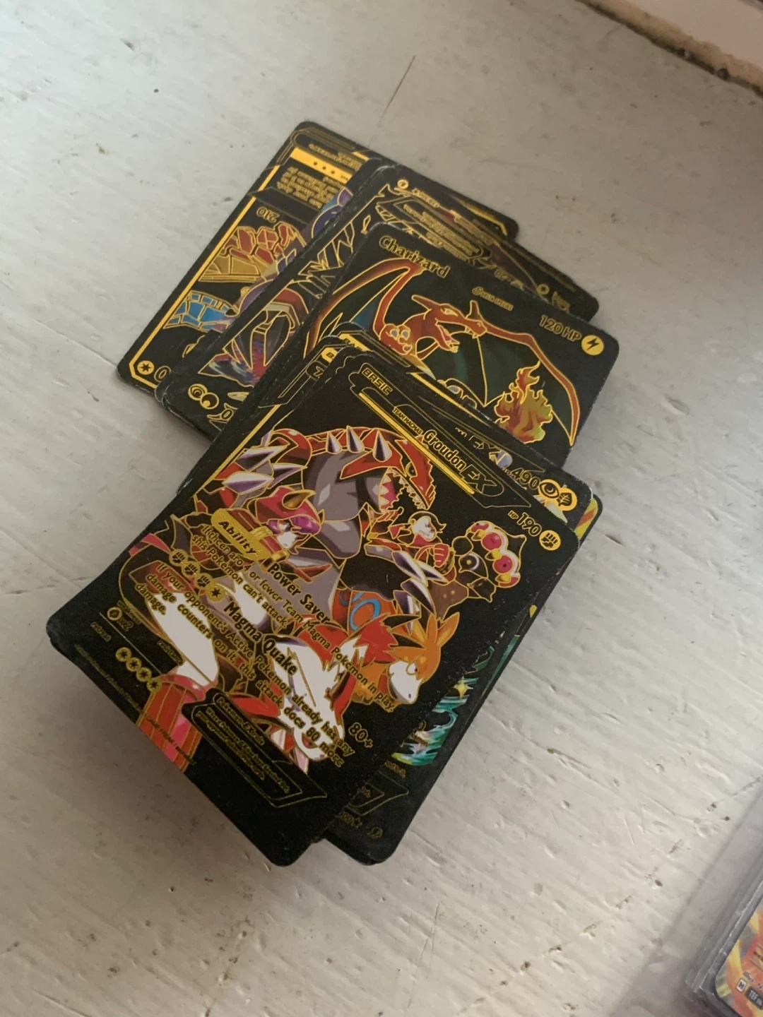 Set of collectible Pokemon EX cards featuring black and gold designs. Cards include Greninja EX, Charizard, and other popular Pokemon. These cards are a great addition to any Pokemon collection!