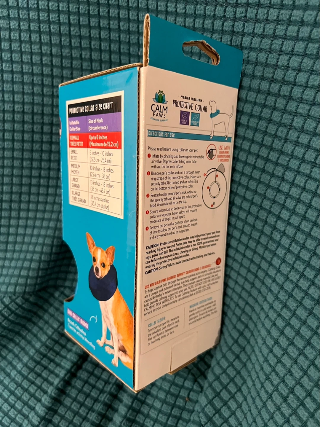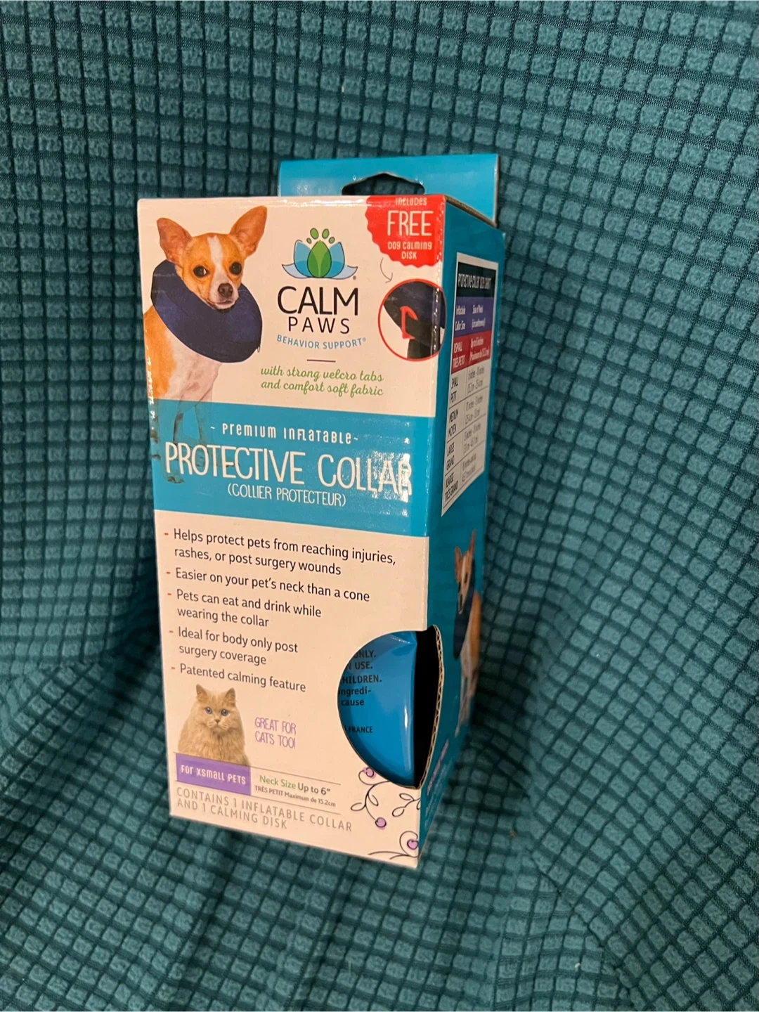 Selling a Calm Paws Protective Collar for pets! It's an inflatable collar designed to help protect your pet from reaching injuries, rashes, or post-surgery wounds. It's easier for your pet to eat and drink while wearing the collar, and it's ideal for body-only post-surgery coverage. This one is size XSmall, for necks up to 6 inches. It also includes a free calming disk