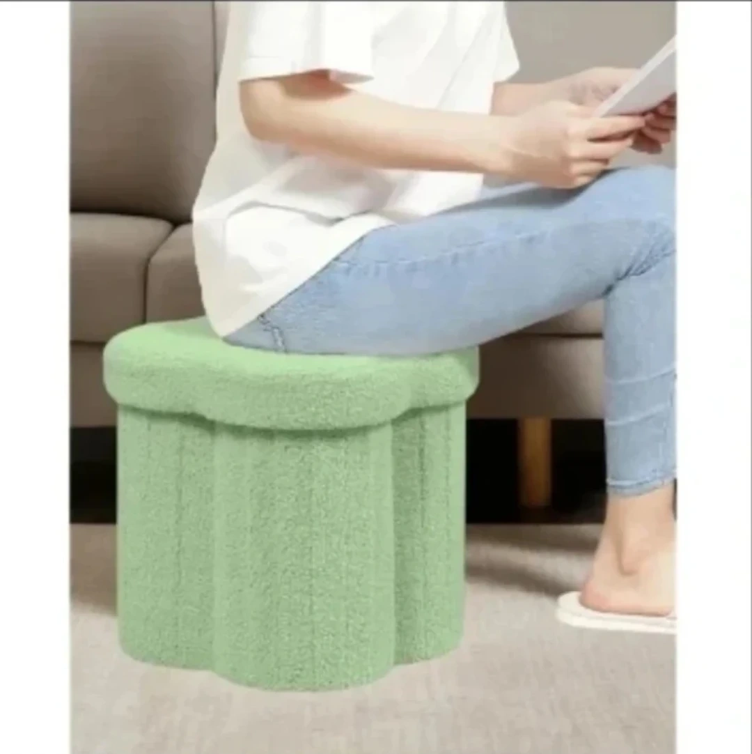 This cute ottoman stool is upholstered in soft, fuzzy green fabric. It can be used for seating or as a footrest. Dimensions are 32cm deep, 32cm wide, and 32cm high.