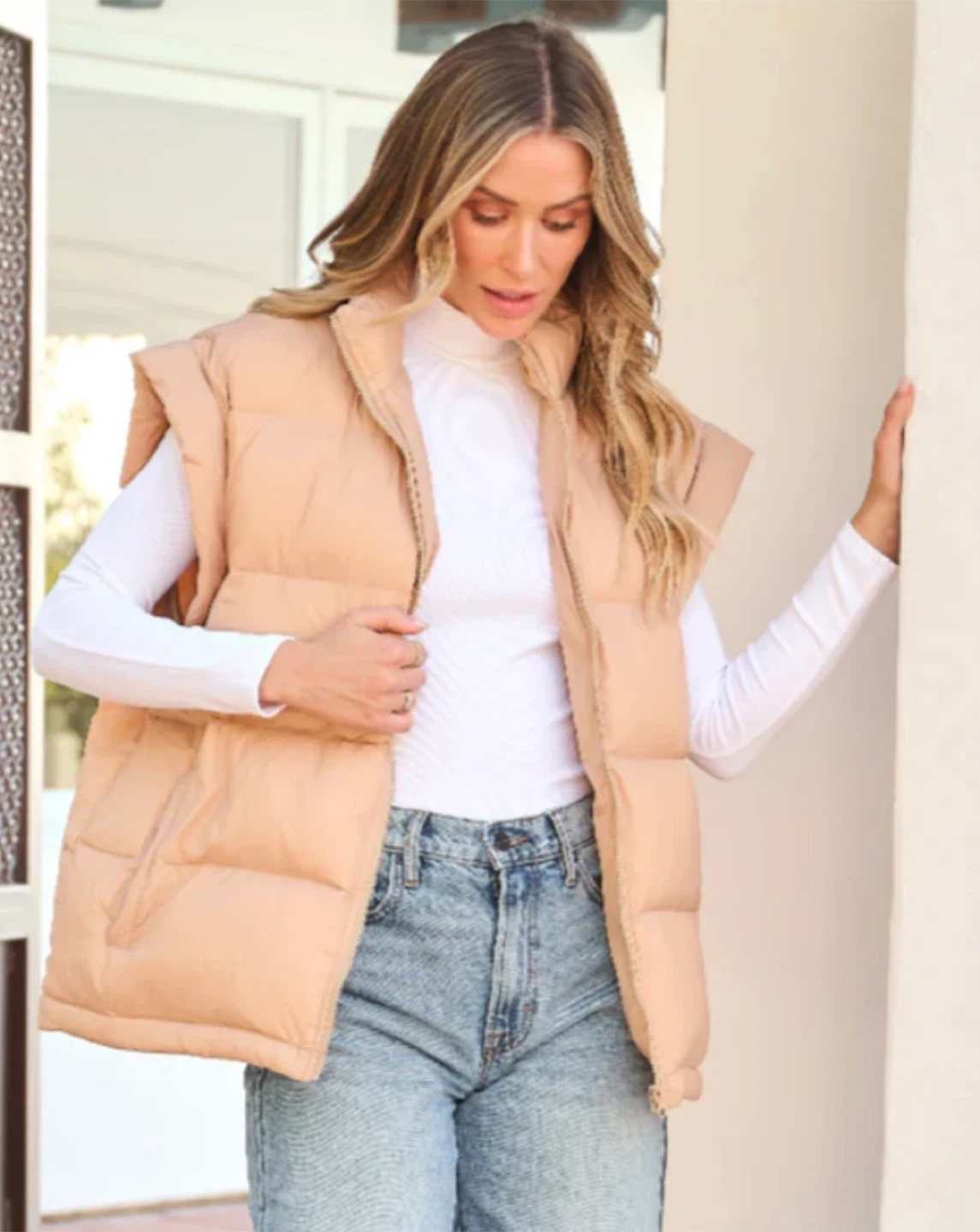 This puffer jacket is designed with removable zipper sleeves, allowing you to transform it into a vest whenever you desire. The oversized look adds a trendy touch to any outfit, keeping you warm, and has room to wear sweaters underneath! Pair it with jeans and boots for a chic winter look.