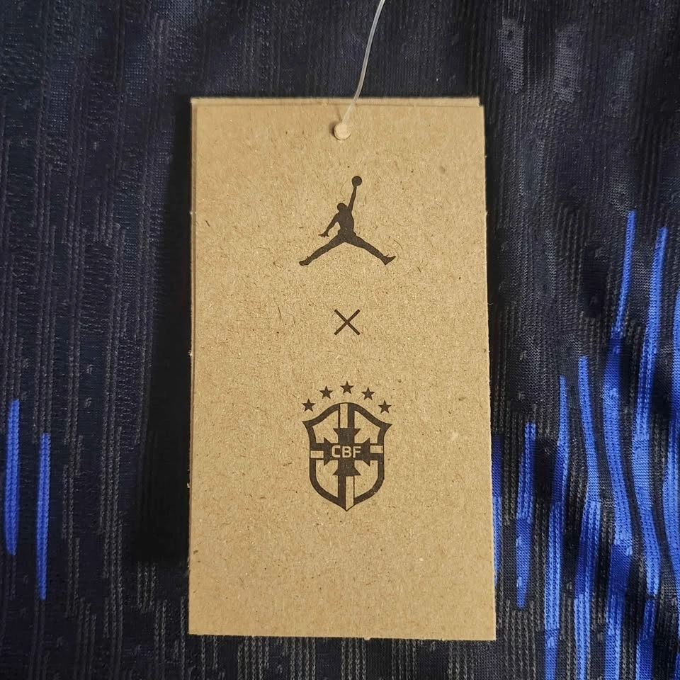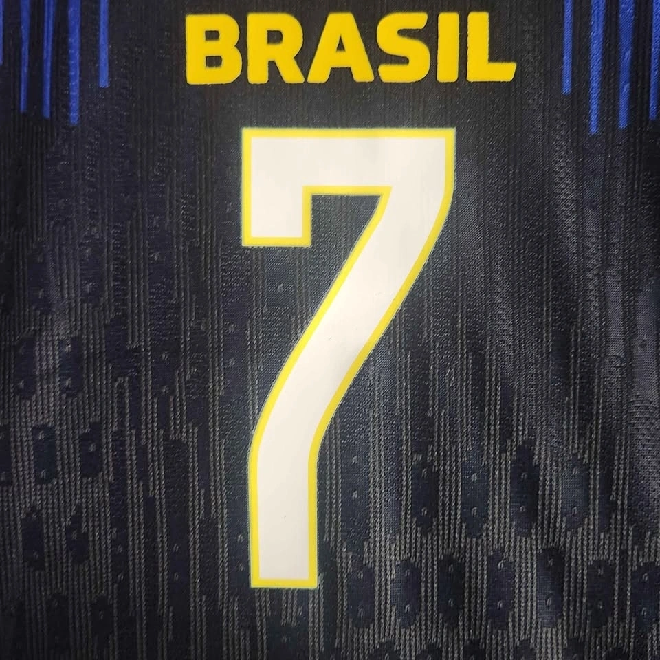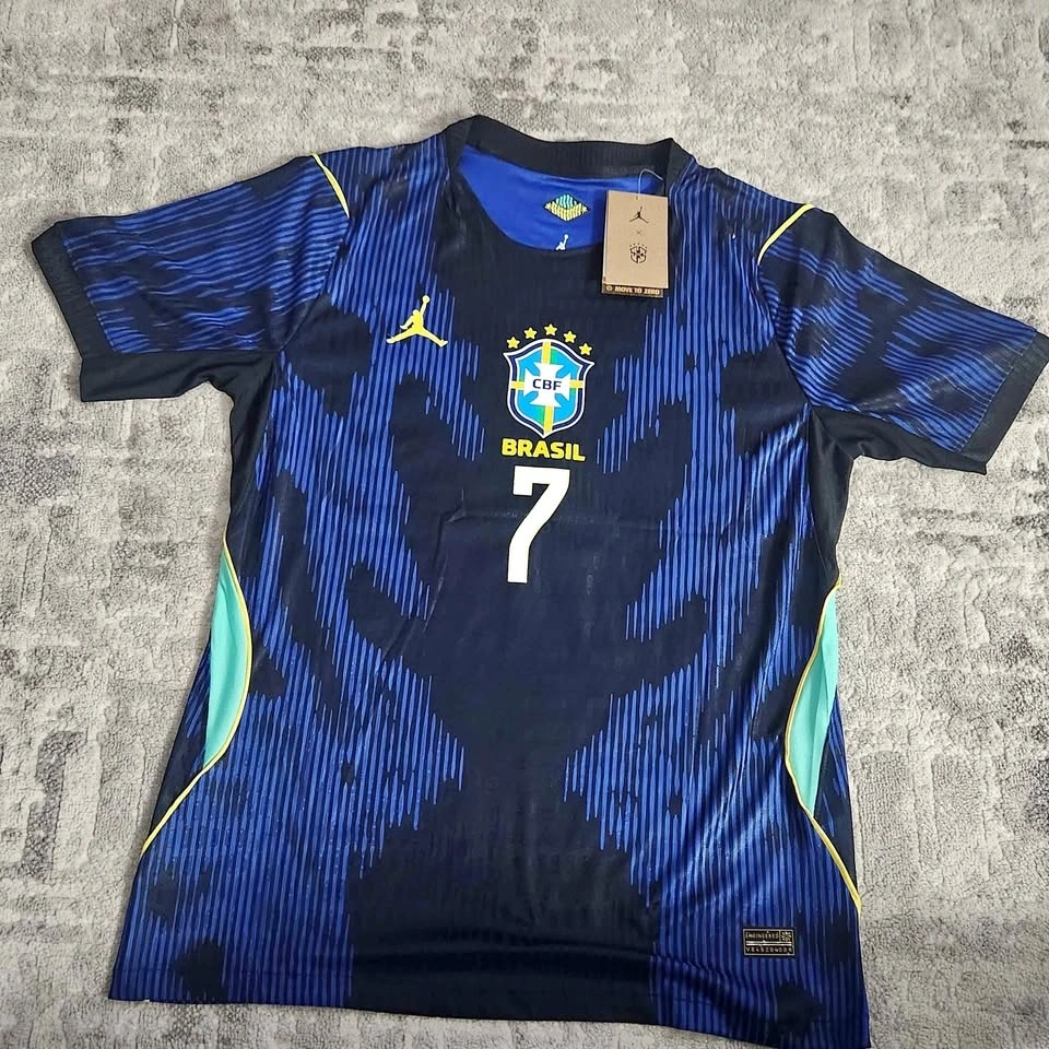 New Brazil national team soccer jersey. It's dark blue with a unique graphic pattern and yellow accents. This Jordan brand shirt has the CBF crest on the chest and the number 7 on the front. Made of breathable athletic fabric.