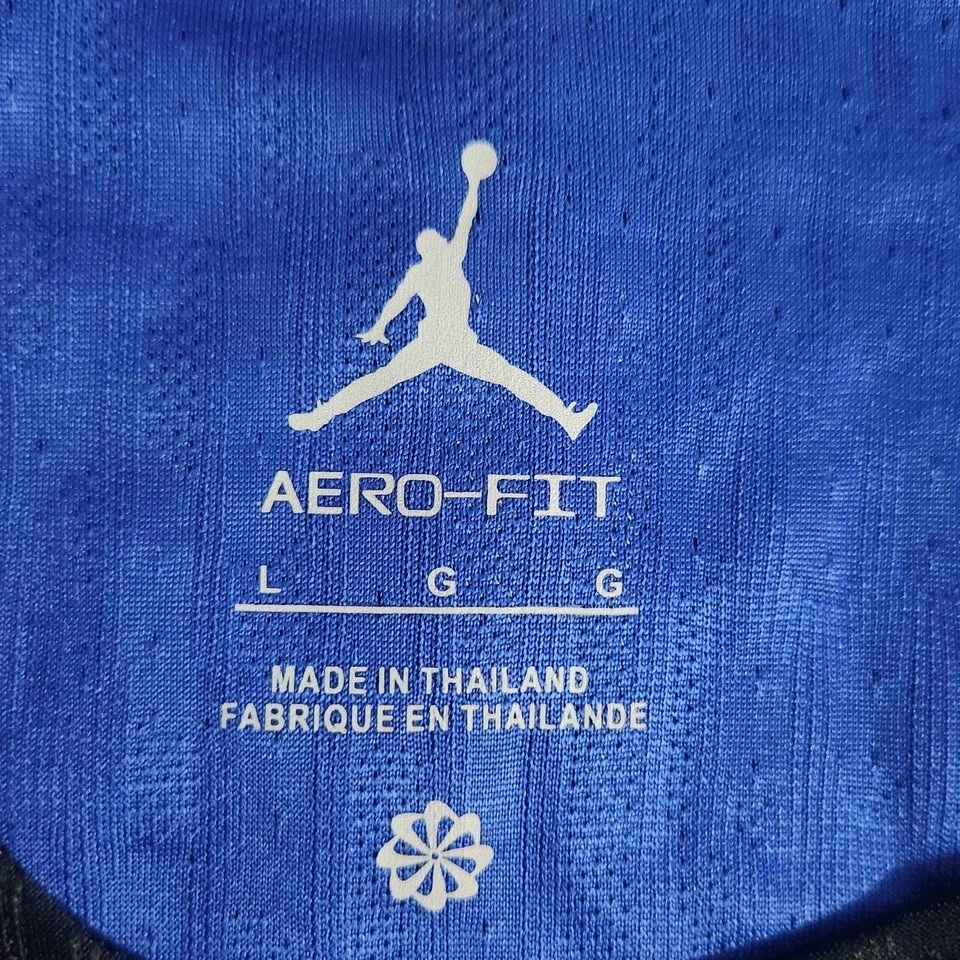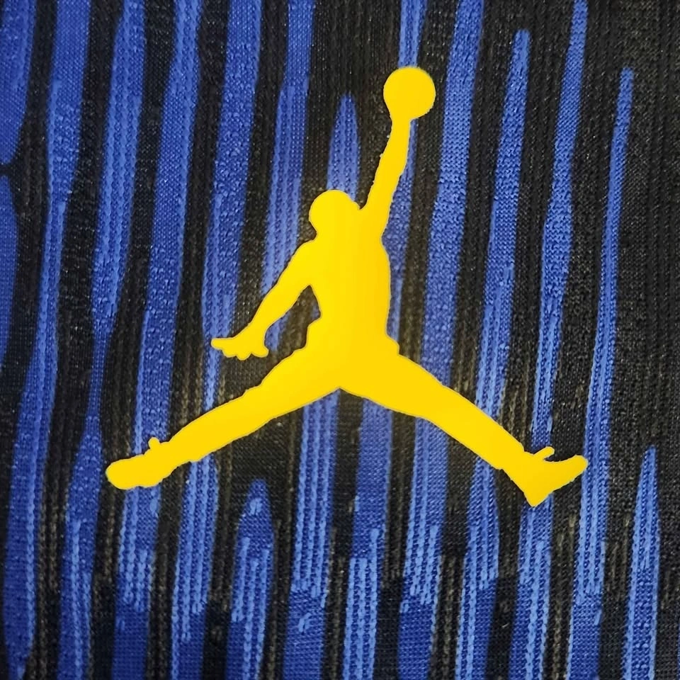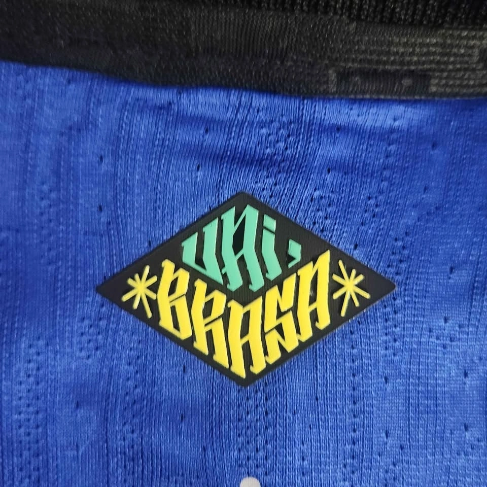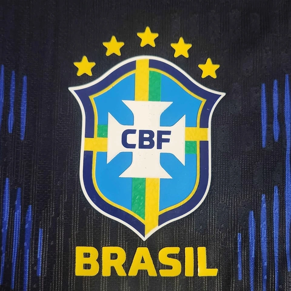 New Brazil national team soccer jersey. It's dark blue with a unique graphic pattern and yellow accents. This Jordan brand shirt has the CBF crest on the chest and the number 7 on the front. Made of breathable athletic fabric.