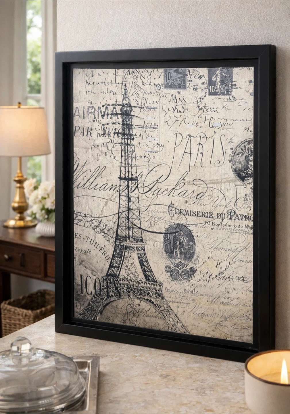 Framed art print featuring a vintage Paris theme with the Eiffel Tower. It's a distressed, graphic style with script text and postage stamps. Black frame.