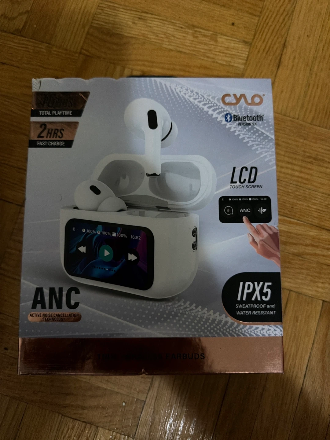 Selling a brand new pair of CYLO TWS earbuds with a screen! These earbuds feature an intuitive touch screen, advanced ANC, and Bluetooth 5.4 technology. They're also sweatproof and water-resistant with an IPX5 rating, perfect for workouts or rainy days. The box advertises a total playtime of 100 hours