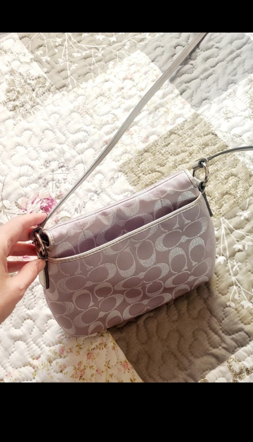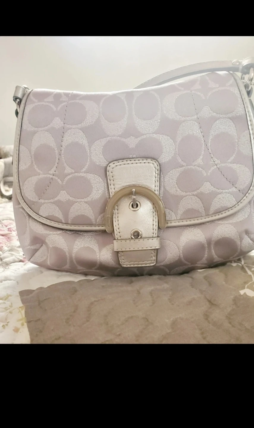 A light gray Coach shoulder bag with the signature "C" print. It's made of a patterned fabric with leather trim. The interior has a zippered pocket. Original Coach purse.