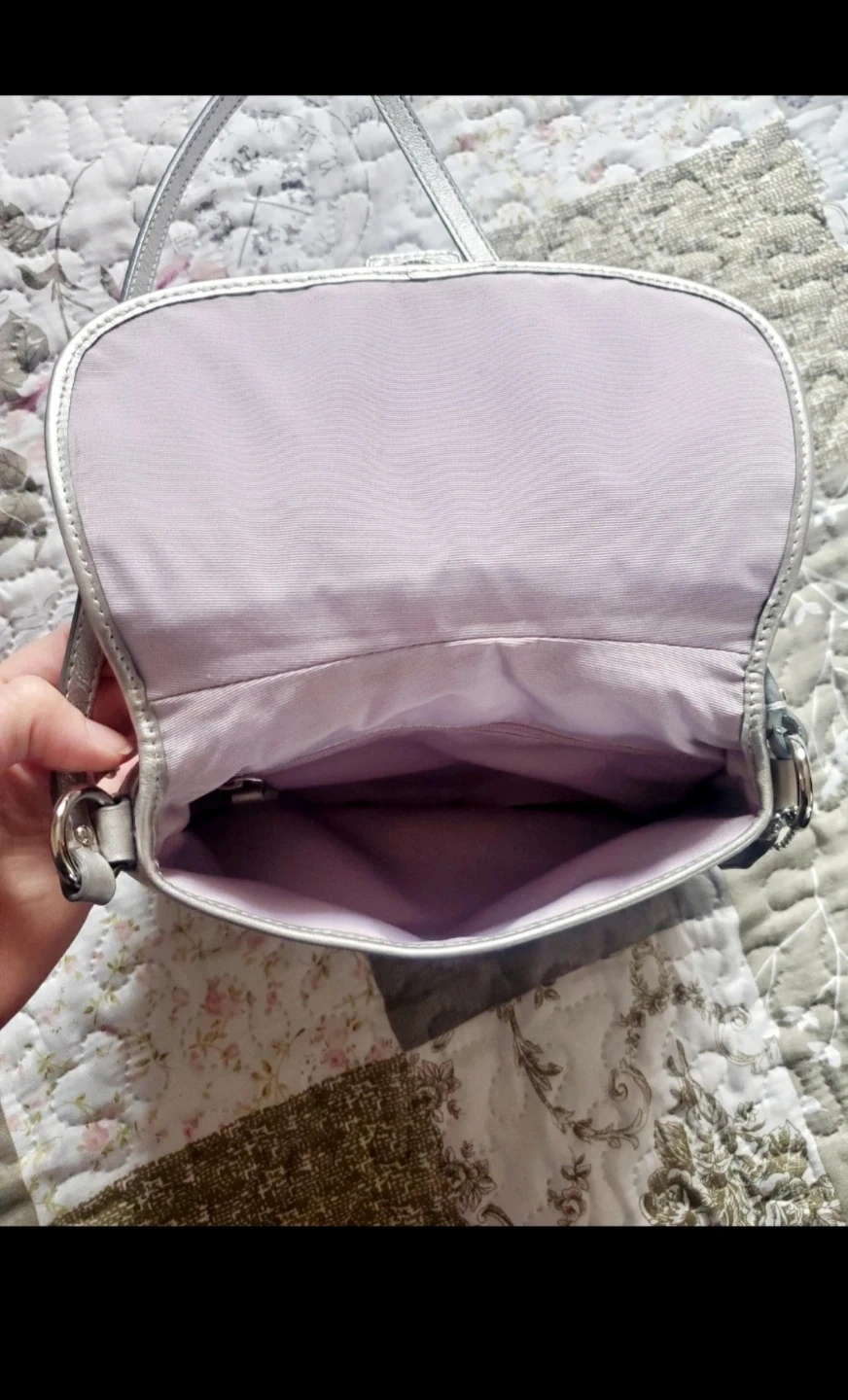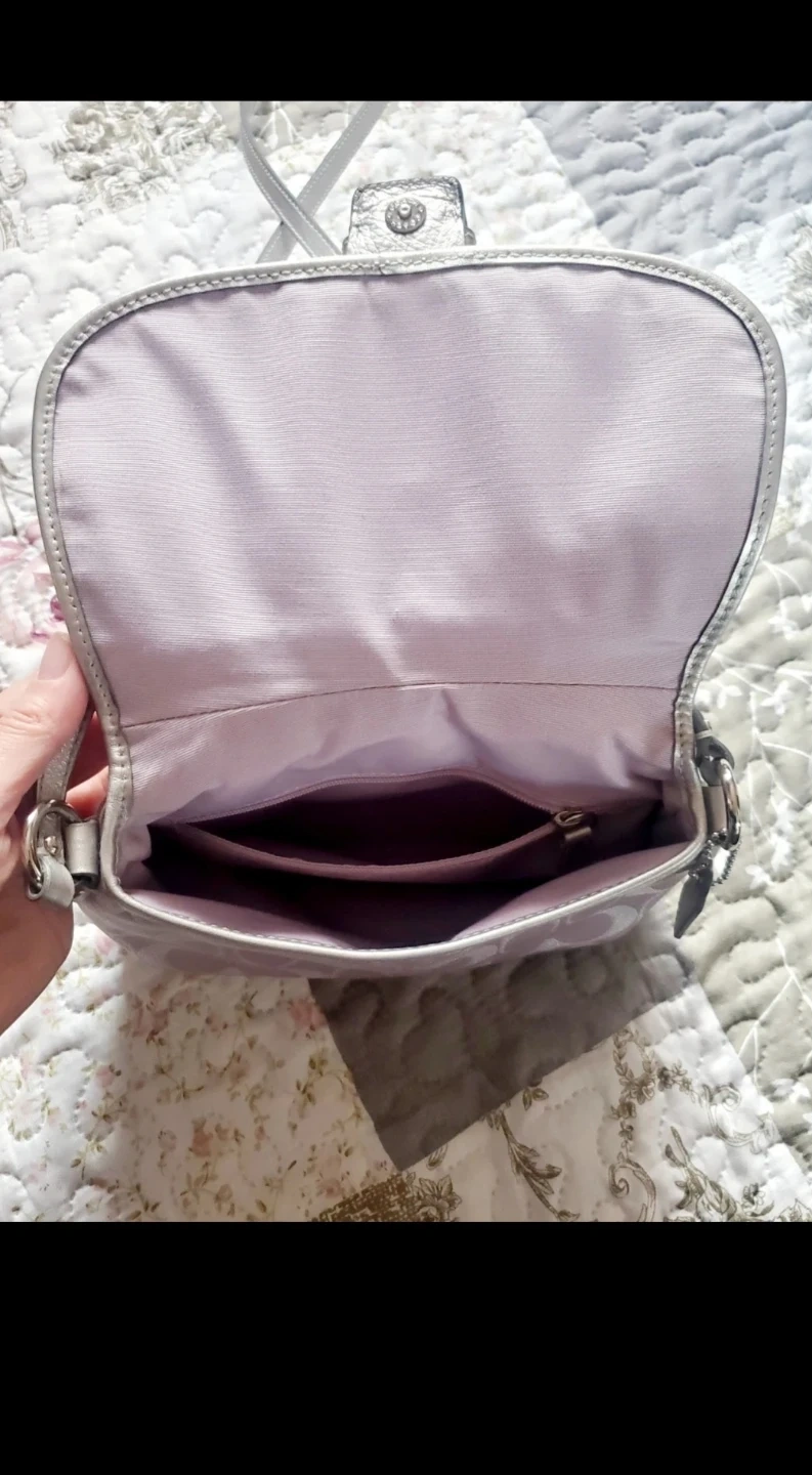 A light gray Coach shoulder bag with the signature "C" print. It's made of a patterned fabric with leather trim. The interior has a zippered pocket. Original Coach purse.