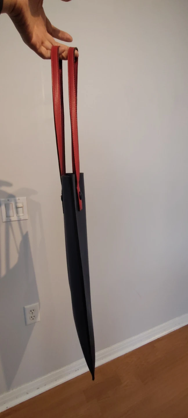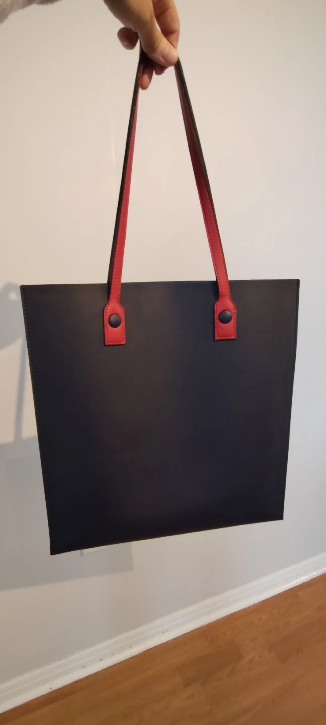 A stylish tote bag with eye-catching red straps. It's in great condition and ready for a new owner! Perfect for carrying your essentials around town or for a day at the office.