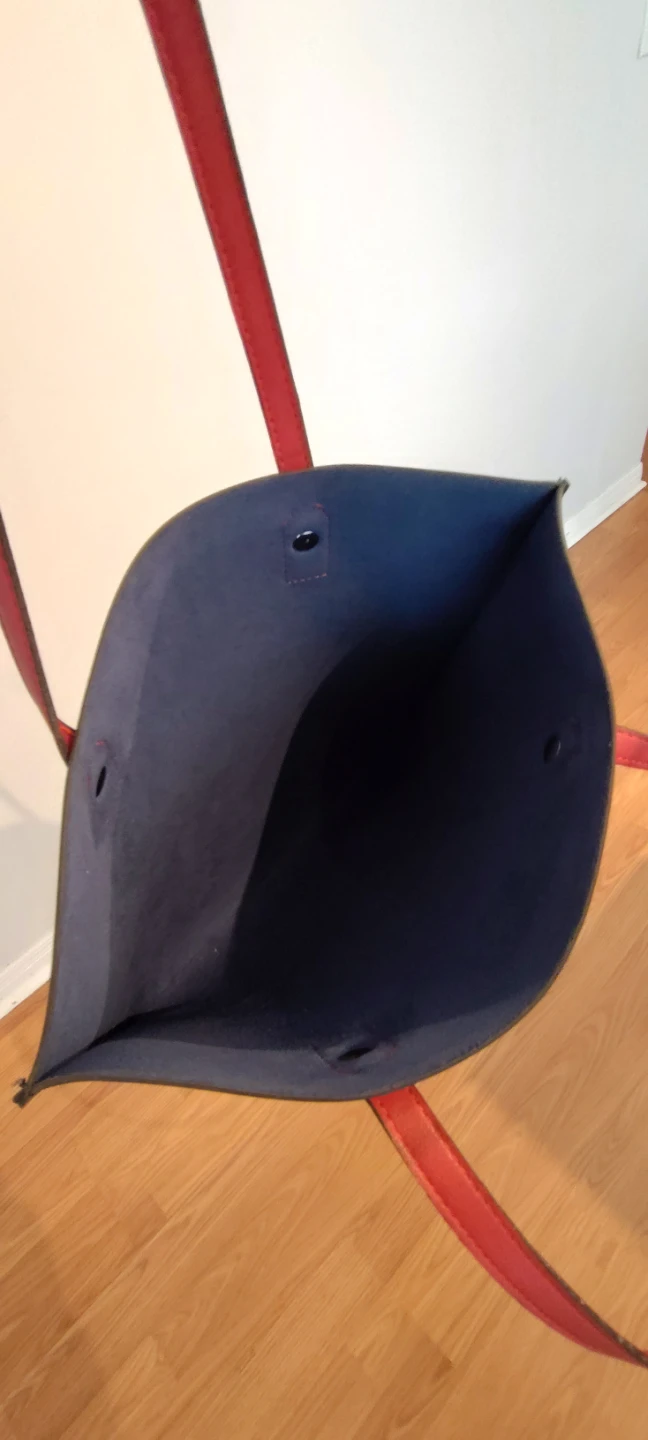 A stylish tote bag with eye-catching red straps. It's in great condition and ready for a new owner! Perfect for carrying your essentials around town or for a day at the office.