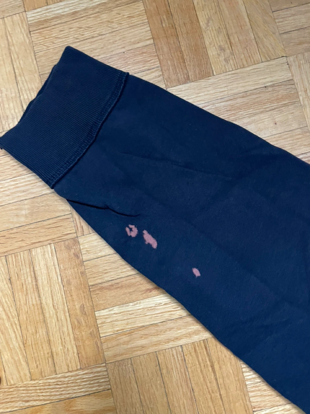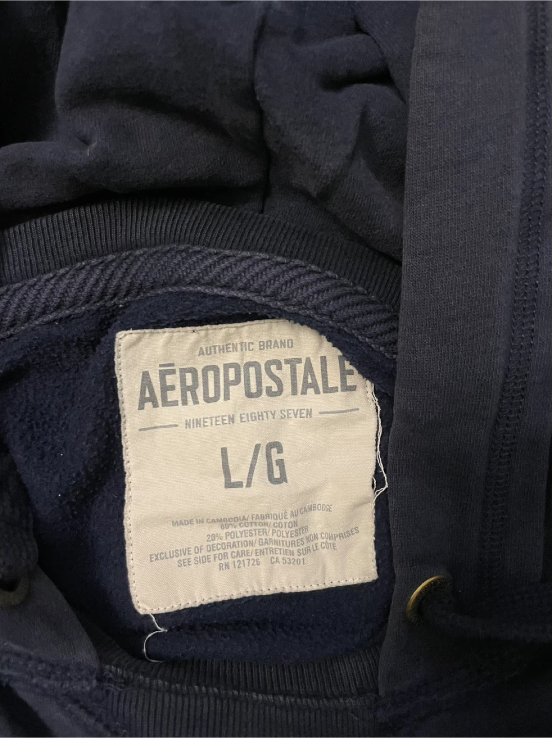 Selling a navy blue Aeropostale hoodie in size large. It's made of 80% cotton and 20% polyester. There are some marks on the sleeve, as shown in the pictures.