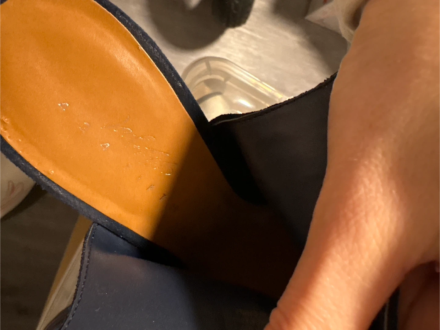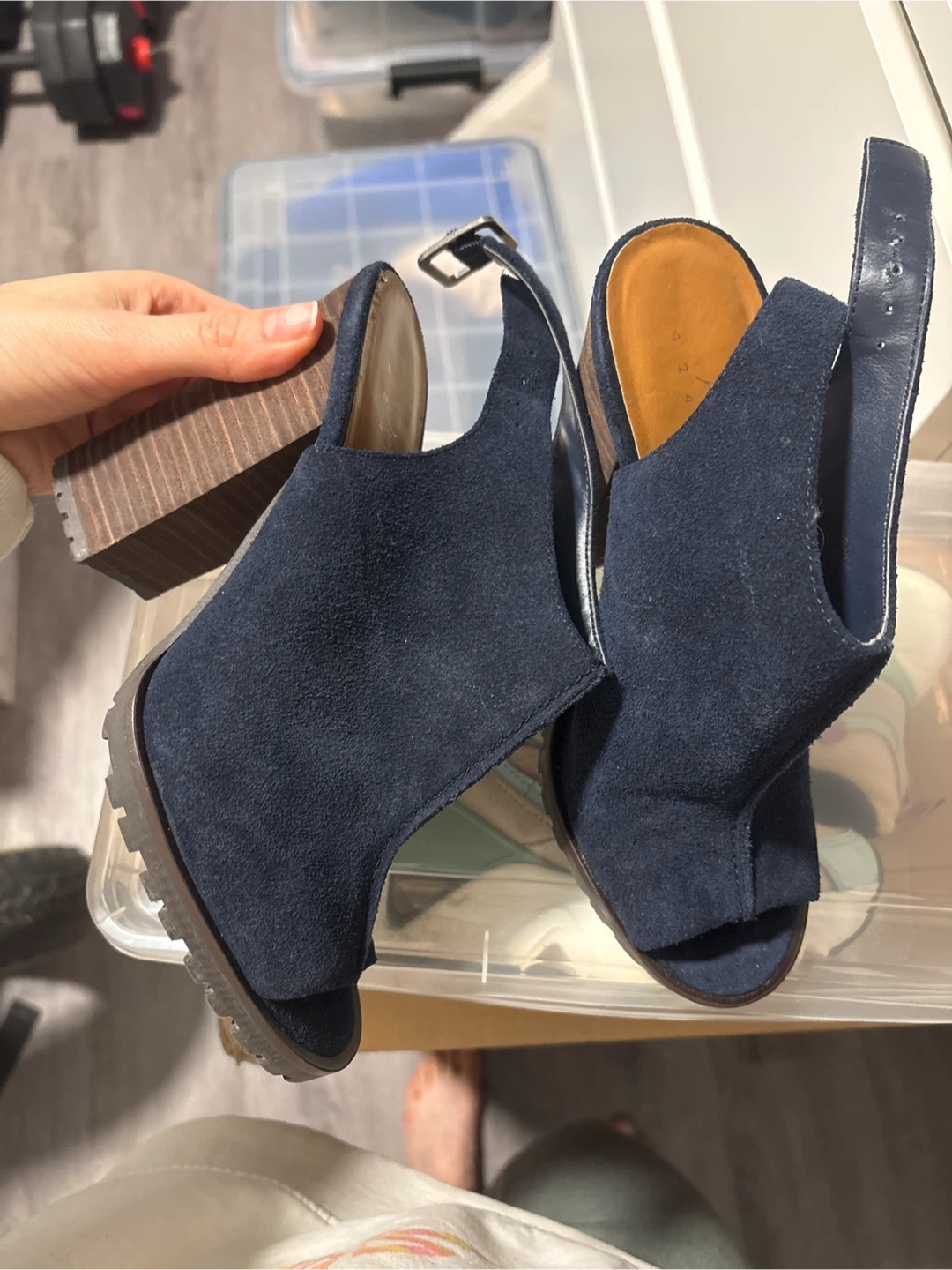 These are a pair of Cole Haan heeled sandals in a lovely blue suede material. They are a size 5 . Please note there are some signs of wear, as pictured