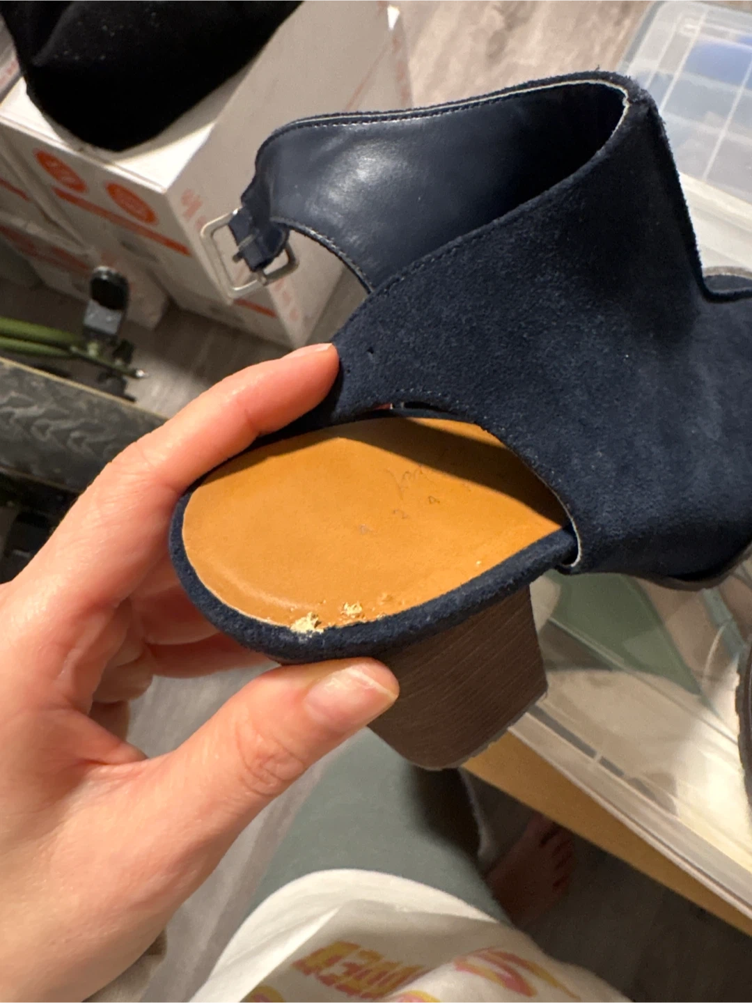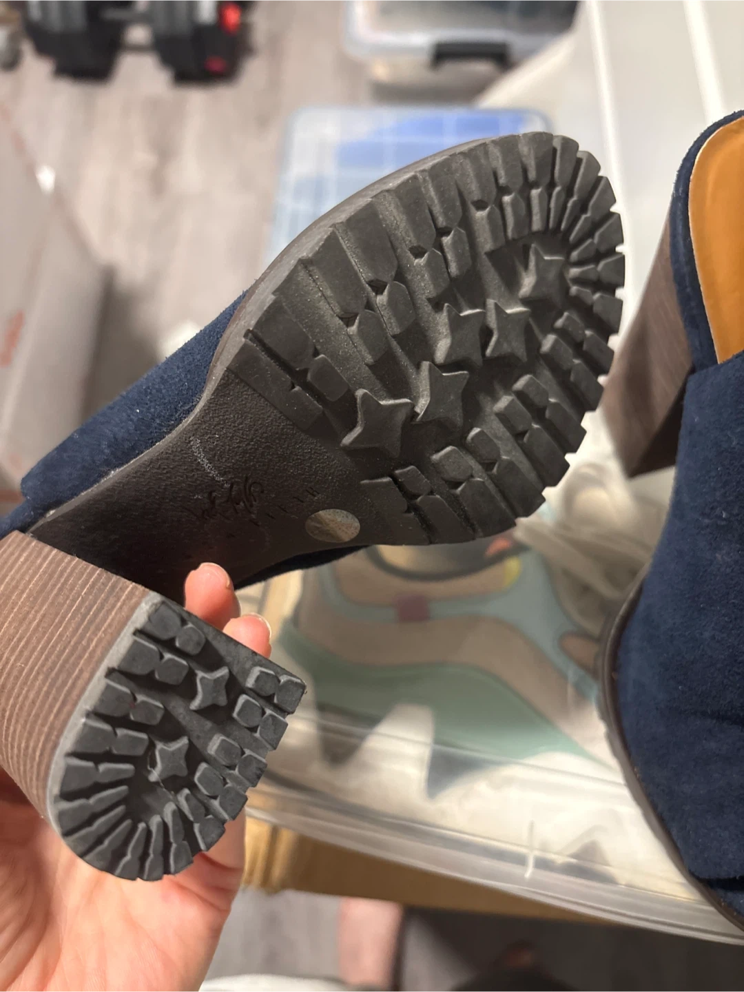 These are a pair of Cole Haan heeled sandals in a lovely blue suede material. They are a size 5 . Please note there are some signs of wear, as pictured