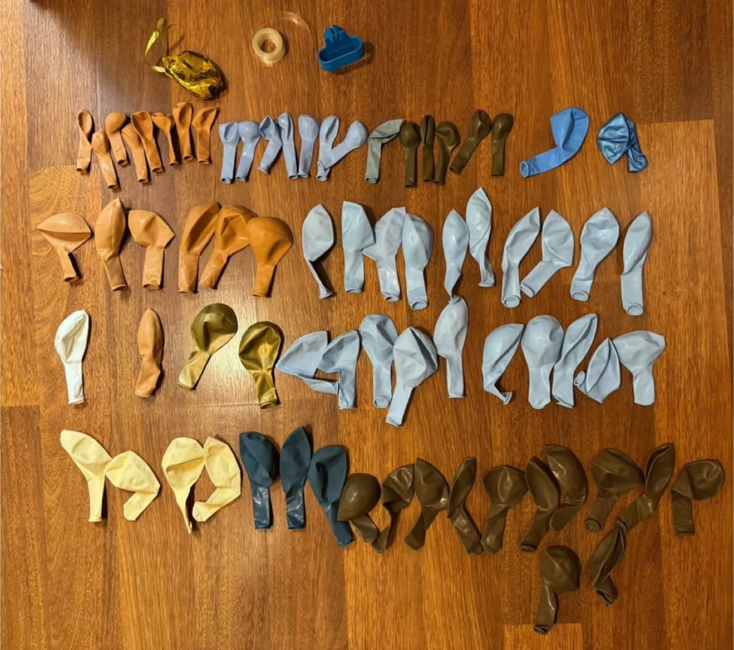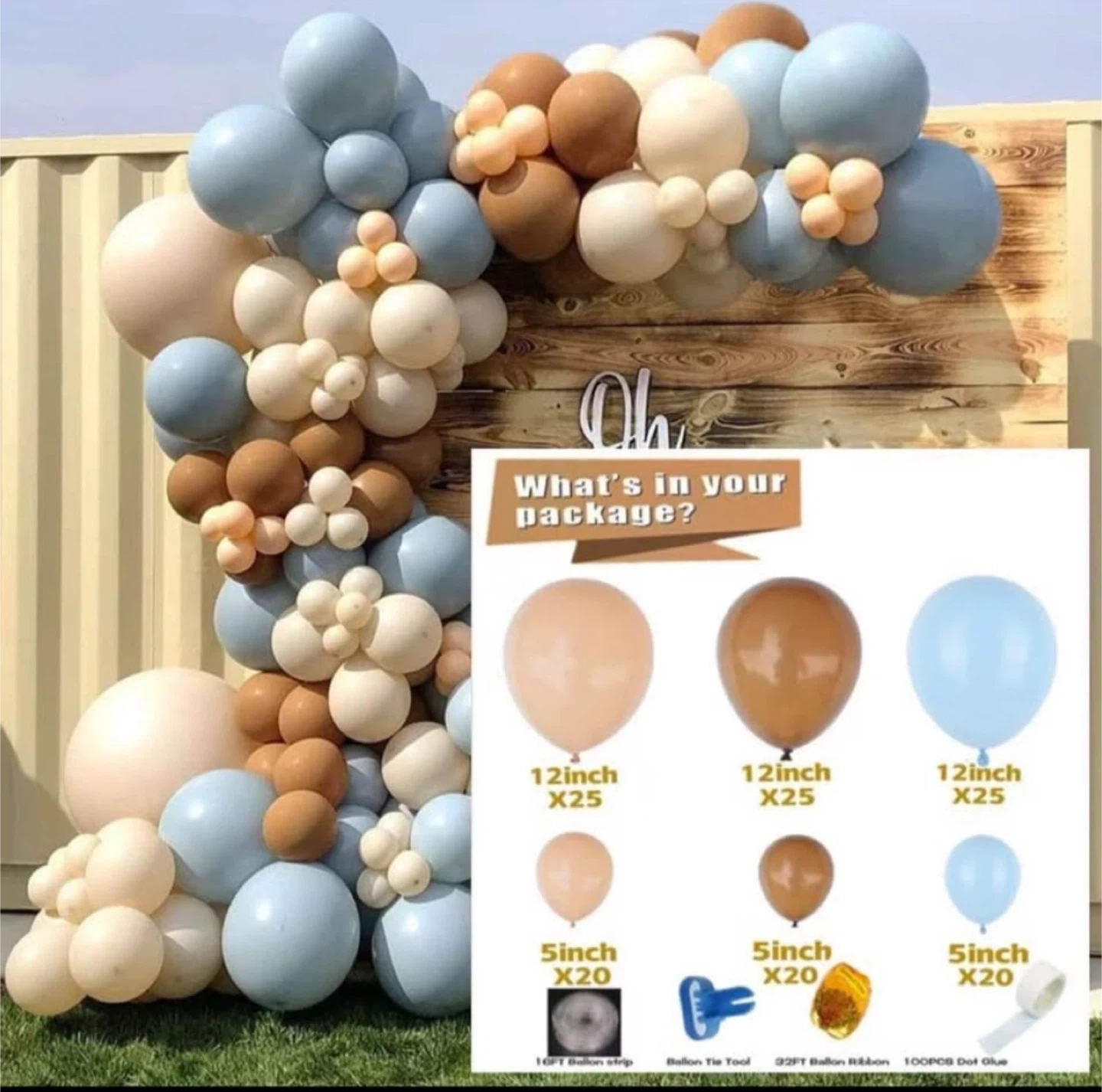 This balloon arch kit includes various sizes of balloons in shades of blue, tan, brown, and cream. You'll get 12-inch and 5-inch balloons, a balloon tie tool, ribbon, and dot glue. It's great for decorating parties or events! never used