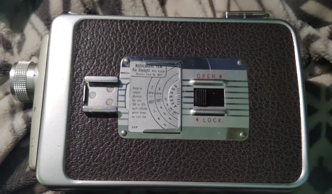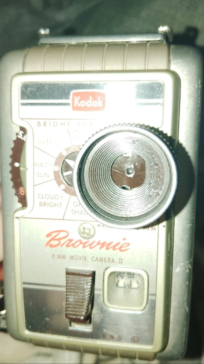 Vintage Kodak Brownie 8mm movie camera II. It's made of metal and faux leather. This camera uses 8mm film for daylight shooting.
