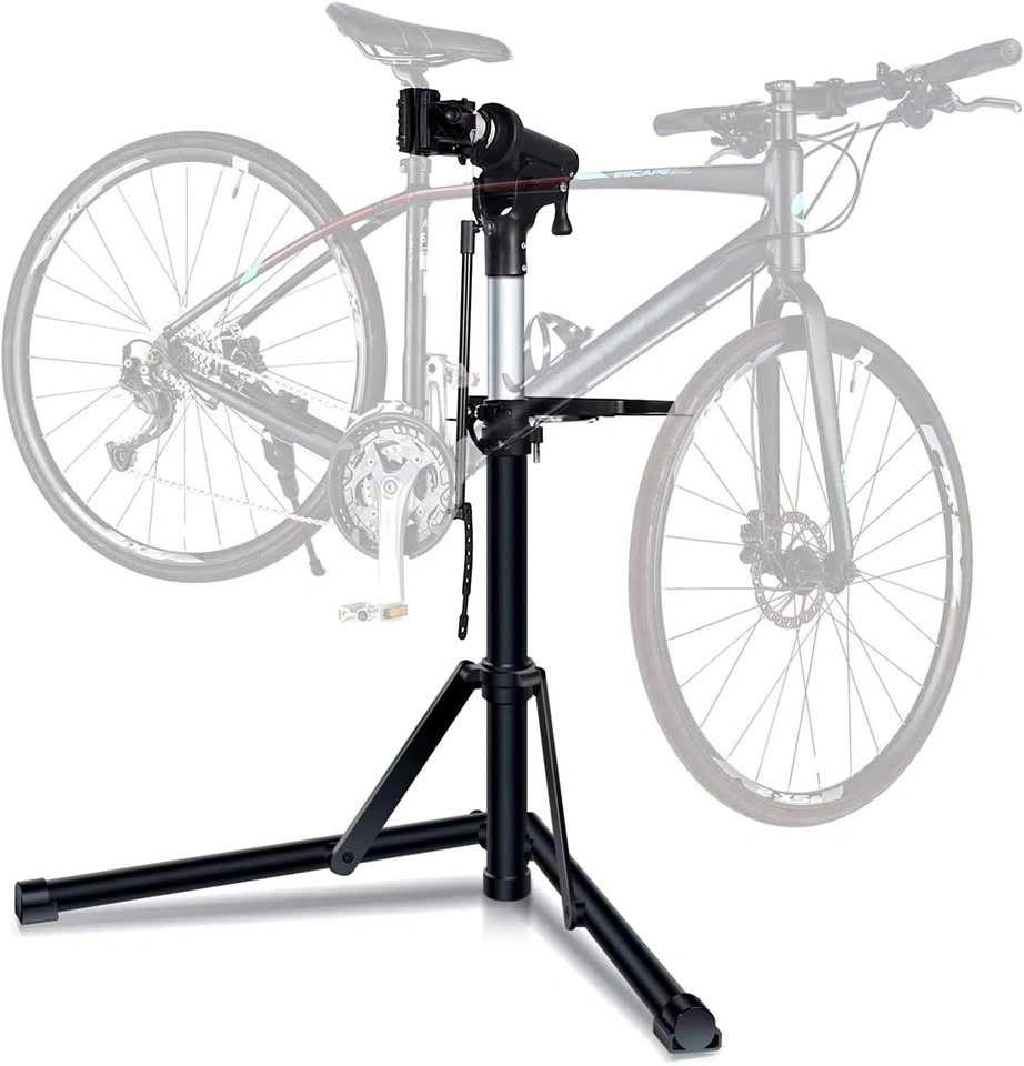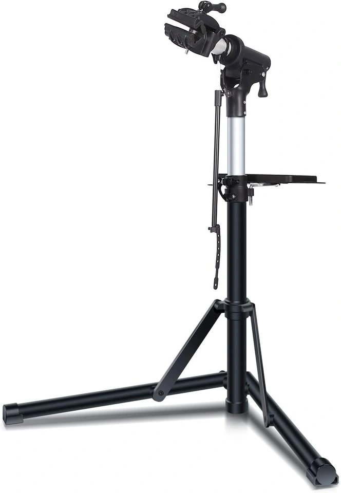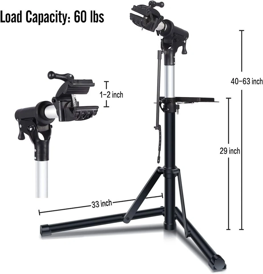 This Techshark bike repair stand uses a triangular structure for support and has rubber foot pads for increased stability, protecting the bracket from wear and tear. The stand features a strong, 1.43-inch diameter circular tube with 0.1-inch wall thickness, and two additional braces for extra stability that can be retracted for easy storage. The premium aluminum body is lightweight, ultra-stable, and can hold up to 60 pounds. It folds flat for convenient storage. The main body extends up to 5.3 feet, and the gripper rotates 360°, perfect for sitting or standing work. Foam support jaws grip your bike securely without damaging the paint or frame. Includes a magnetic tool tray for organizing small parts and a retractable rod to stabilize the front wheel.