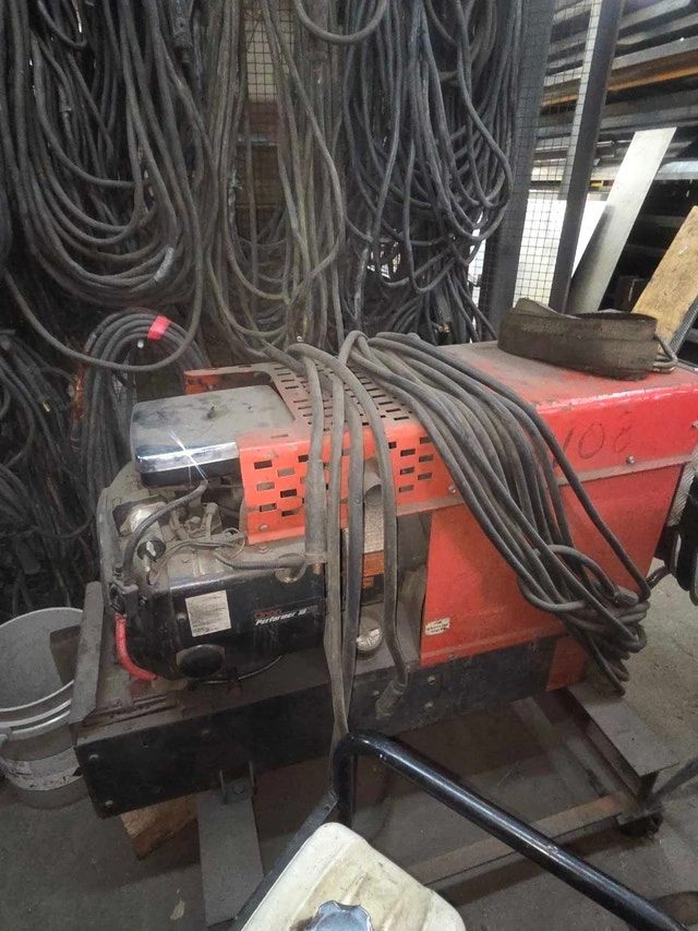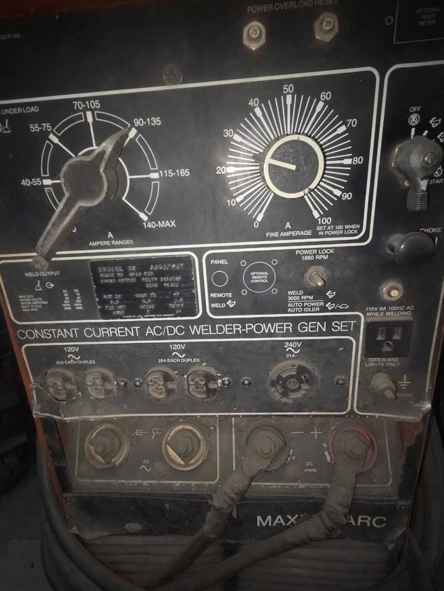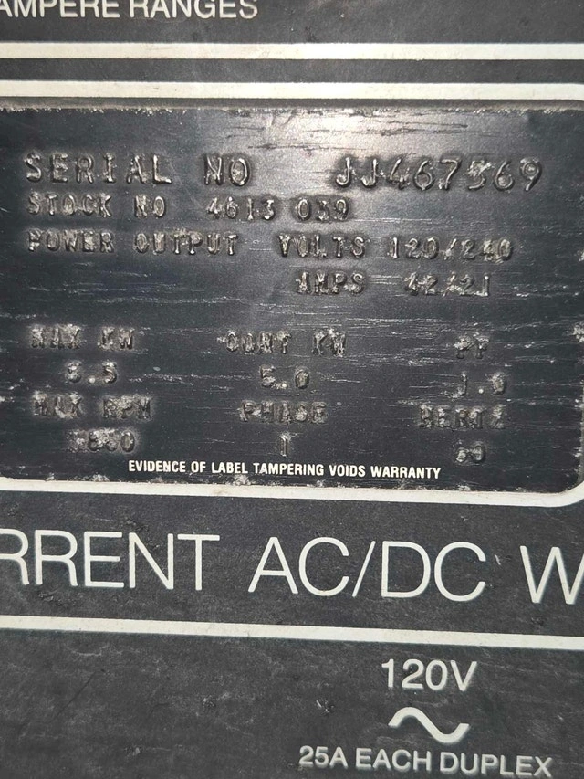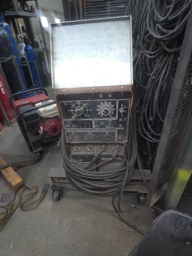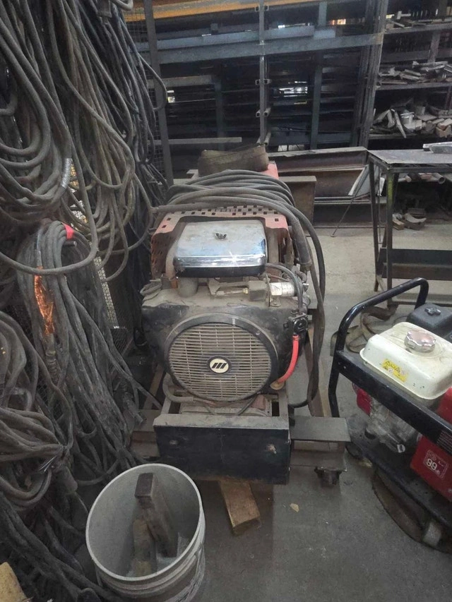 Older Onan/Miller Ac/Dc 18 h.p. gas engine welder-generator. Older unit with no hour gauge, probably around 2000 hrs but well maintained. Look at nameplate photo for machine specs. Can be fired up to test, but will need a battery for everyday use. Has constant power while welding plug (120 volt @ 9A). Also has 2 duplex 120 volt plugs for gen only @ 25A and one Nema 17 240 volt plug @ 21A. Comes with 50 foot 1/o cables attached with twist lock tweco style ends. These machines were built to last and run consistent under heavy load and distance. $3000.00 O.B.O.