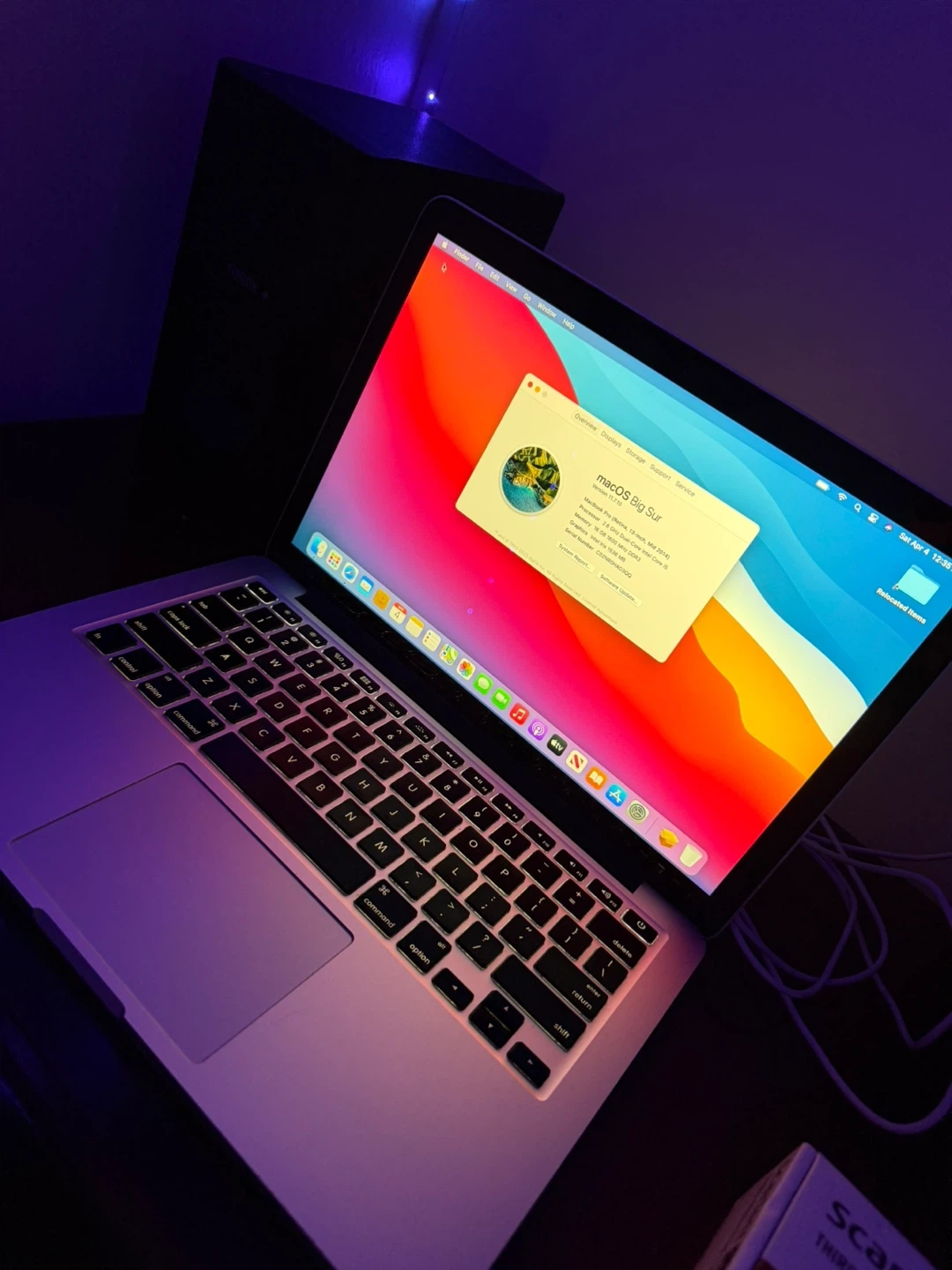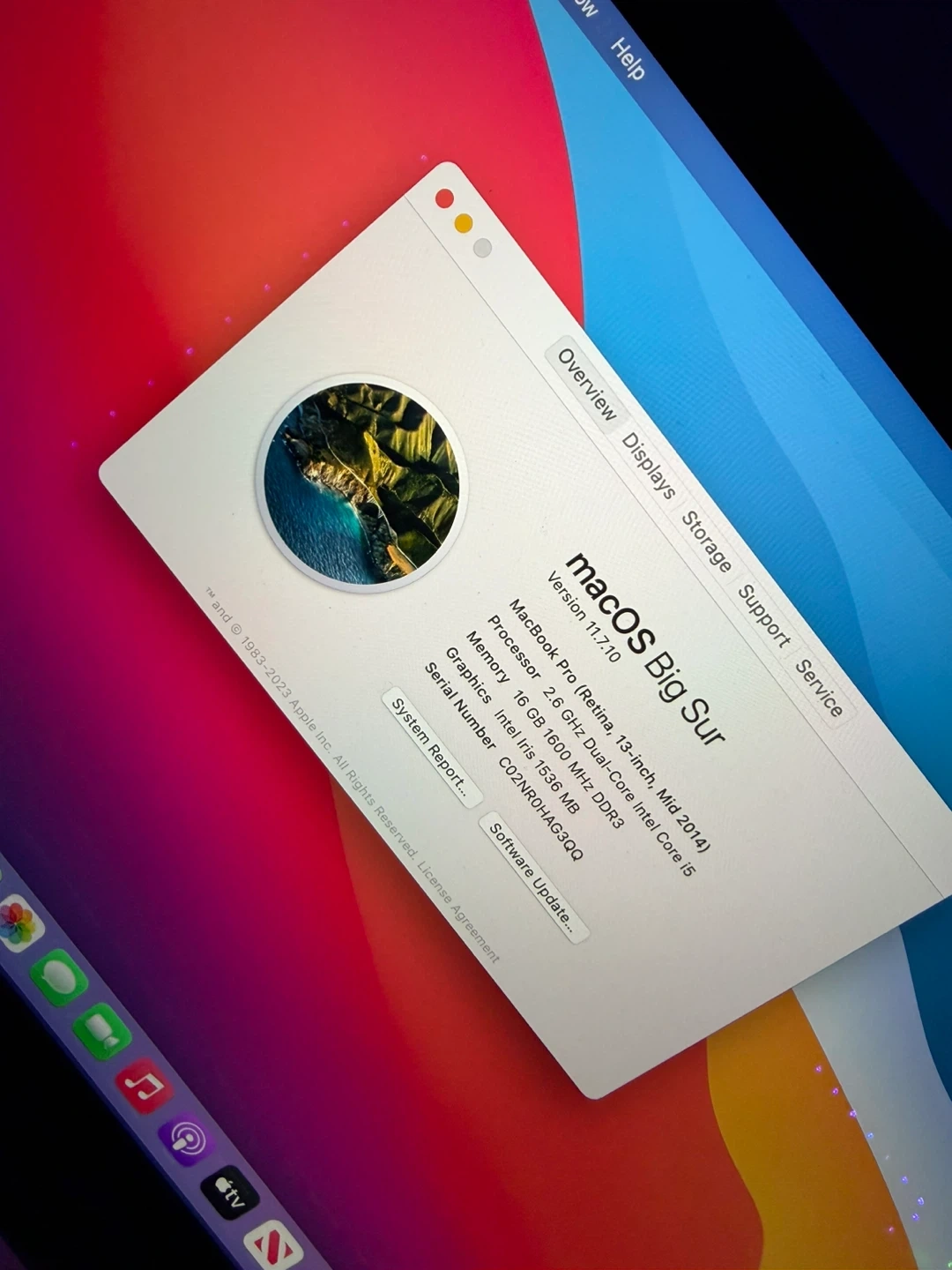 Apple MacBook Pro, 13-inch Retina display from mid-2014. It's equipped with a 2.6 GHz Intel Core i5 processor and 16 GB of 1600 MHz DDR3 RAM. Graphics are Intel Iris 1536 MB. This laptop runs macOS Big Sur. Great for students and professionals needing a reliable machine!