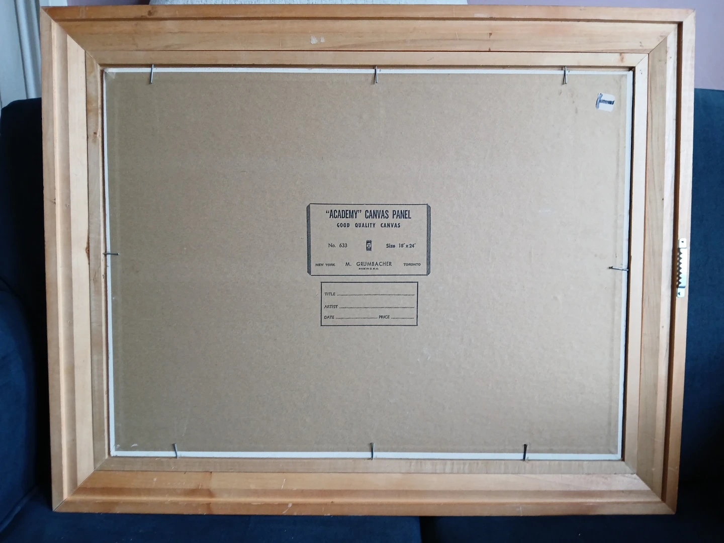 Age: Label design and the frame style suggest this was produced between the 1950s and 1970s. Artist: The back label is blank.( Often hidden in the lower corners or among the grass), it is considered " unsigned "or Attributed to an unknown hand. Condition: The canvas panel appears stable. The woodframe is a standard Mid-Century mired design with a linen styled liner. This piece measures 18 inches by 24 inches. It depicts a rustic scene with stone and wood elements. The back label indicates it's a "Good Quality Canvas". Ready to hang.