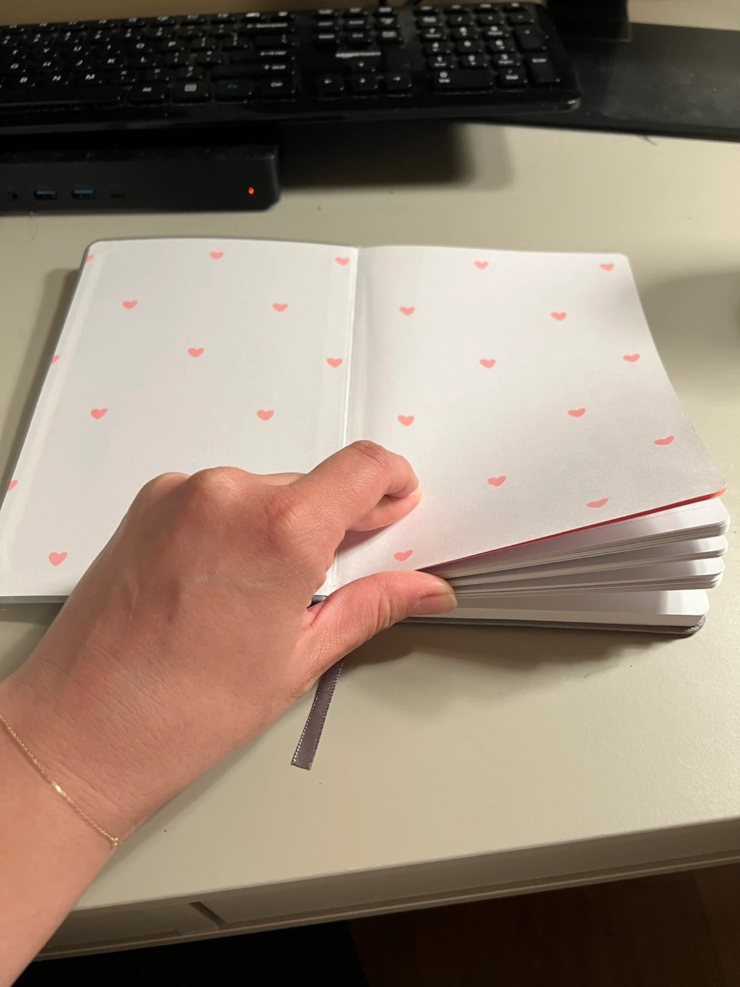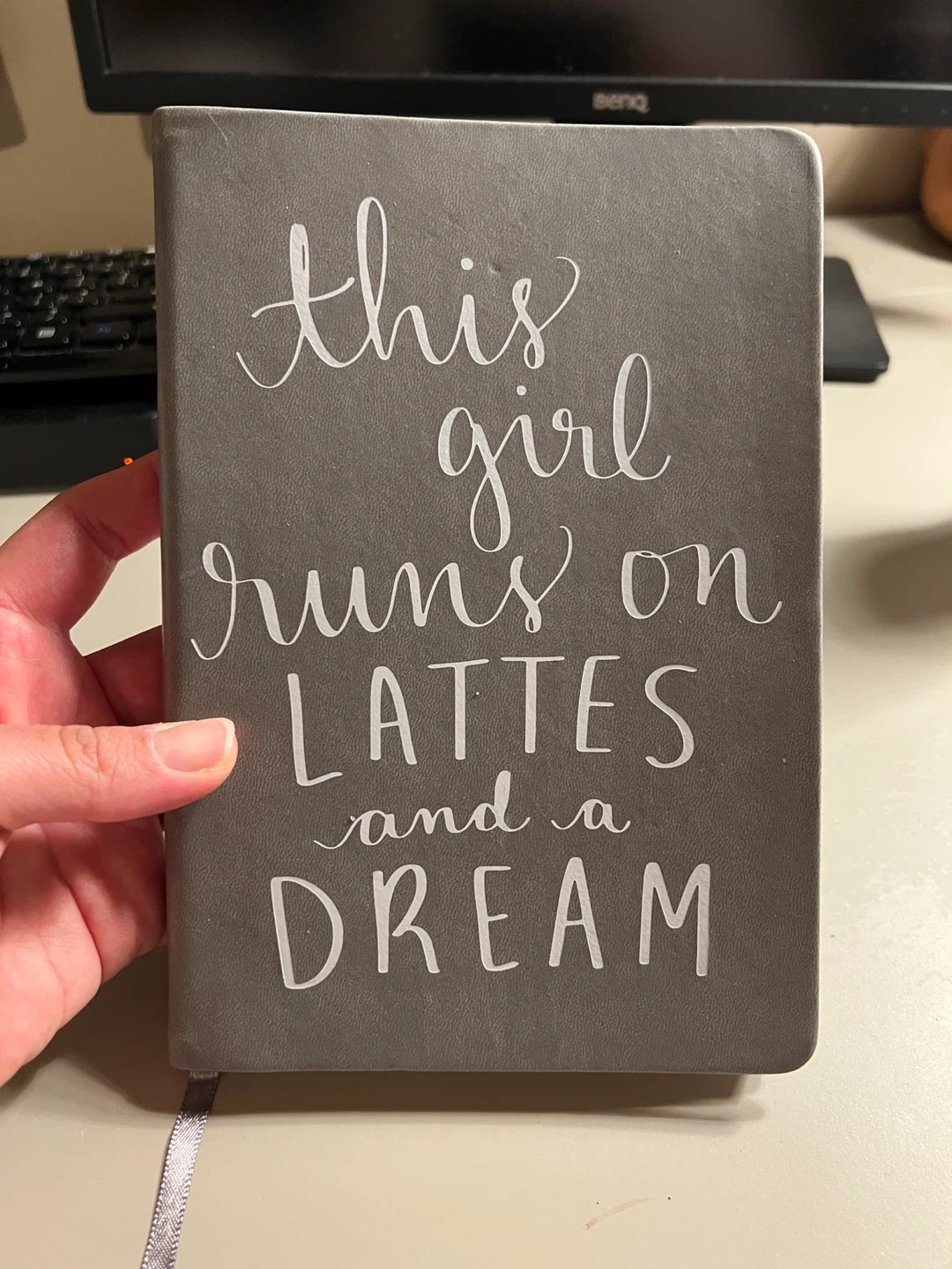 Never used, brand new grey journal with a cute "this girl runs on lattes and a dream" quote on the cover. It's a great place to jot down your thoughts or plans. The inside pages feature a subtle pink heart pattern. Comes with a ribbon bookmark.