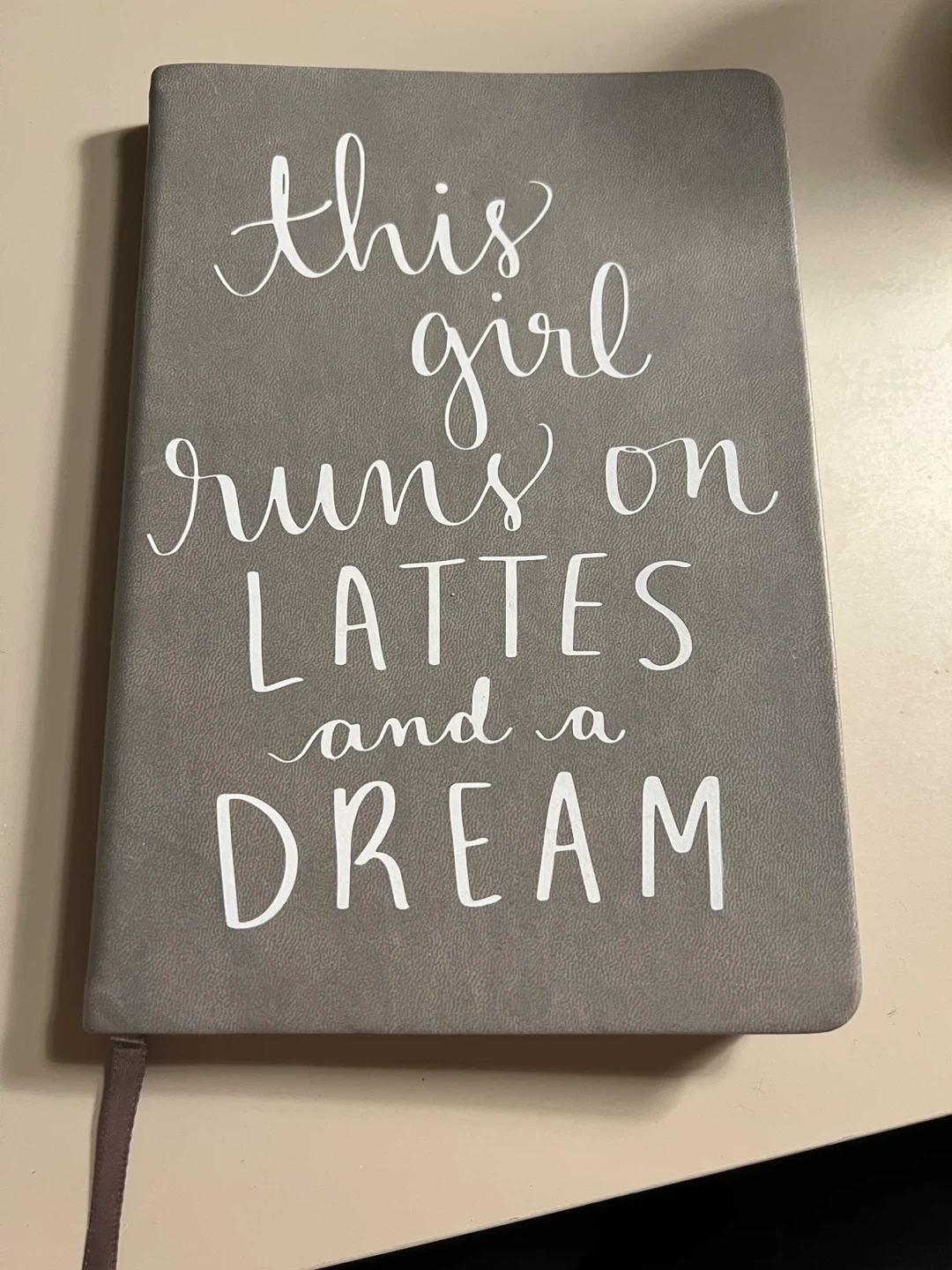 Never used, brand new grey journal with a cute "this girl runs on lattes and a dream" quote on the cover. It's a great place to jot down your thoughts or plans. The inside pages feature a subtle pink heart pattern. Comes with a ribbon bookmark.