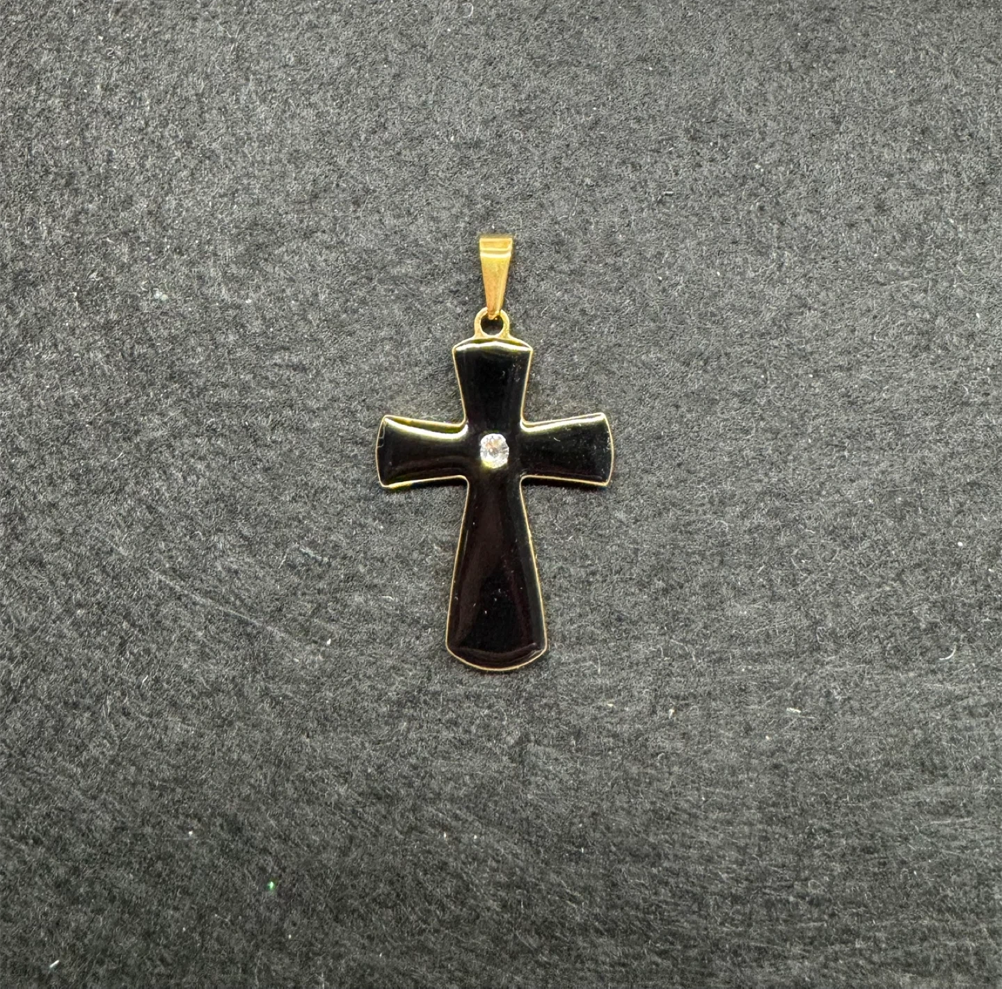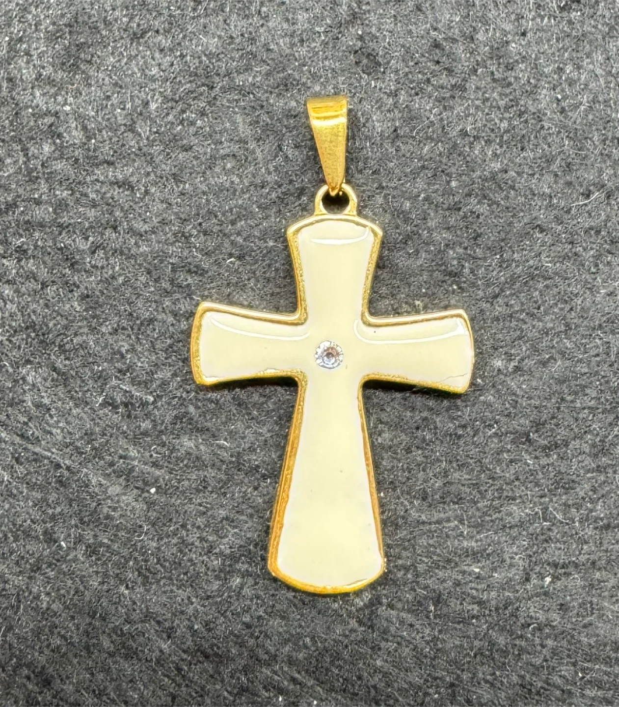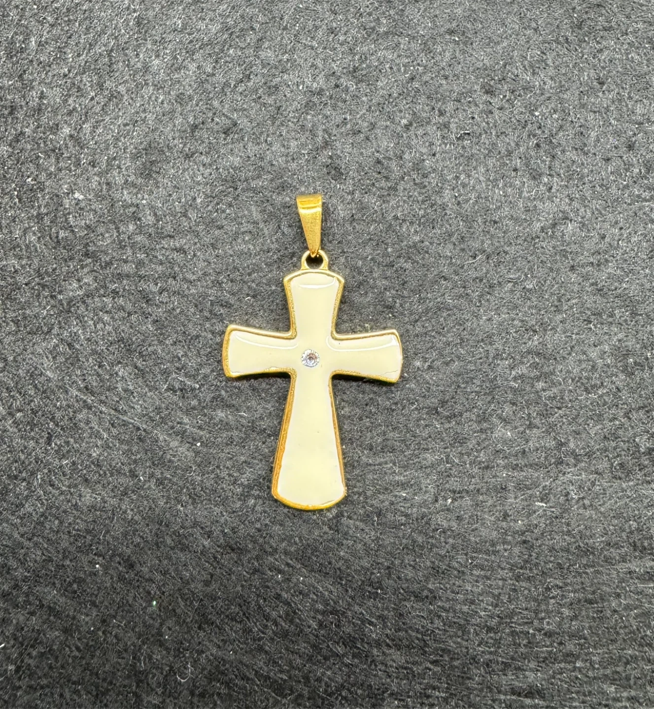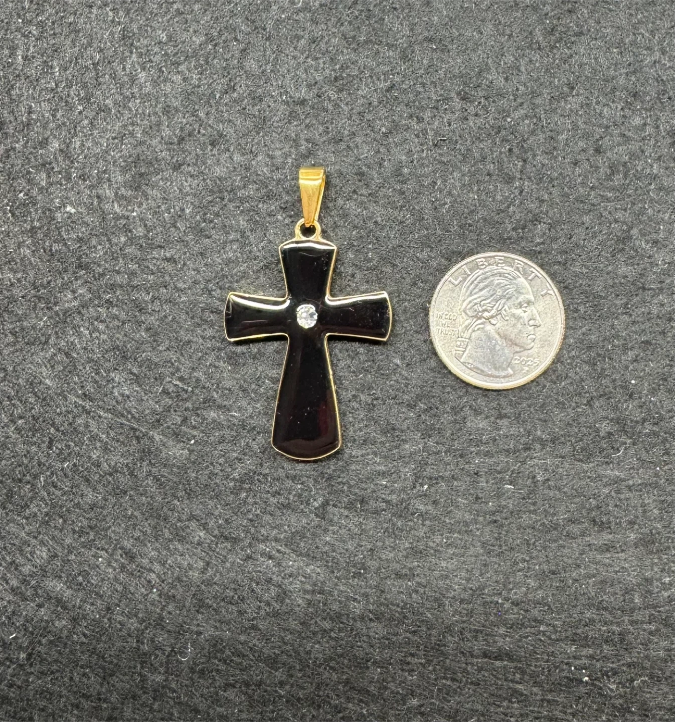 Two sided Enameled Cross with CZ Clear stone accent. It has a gold bail for hanging.