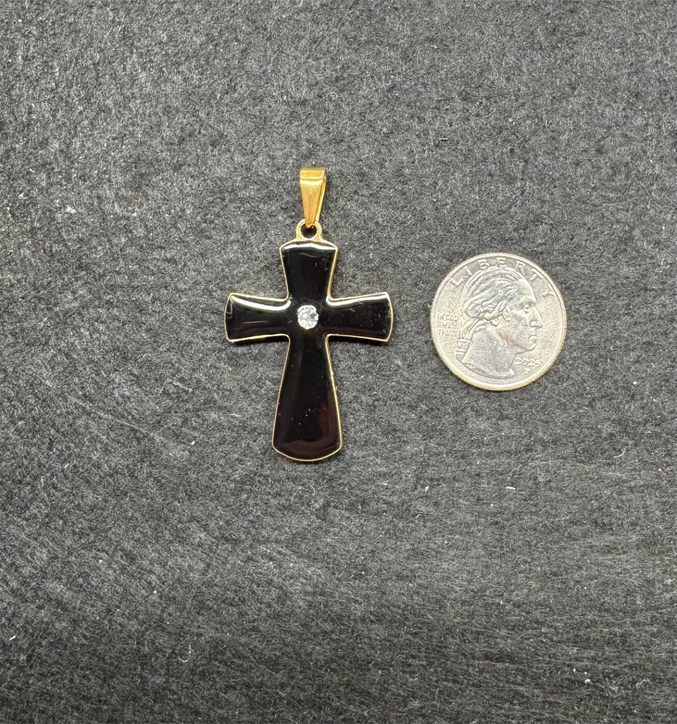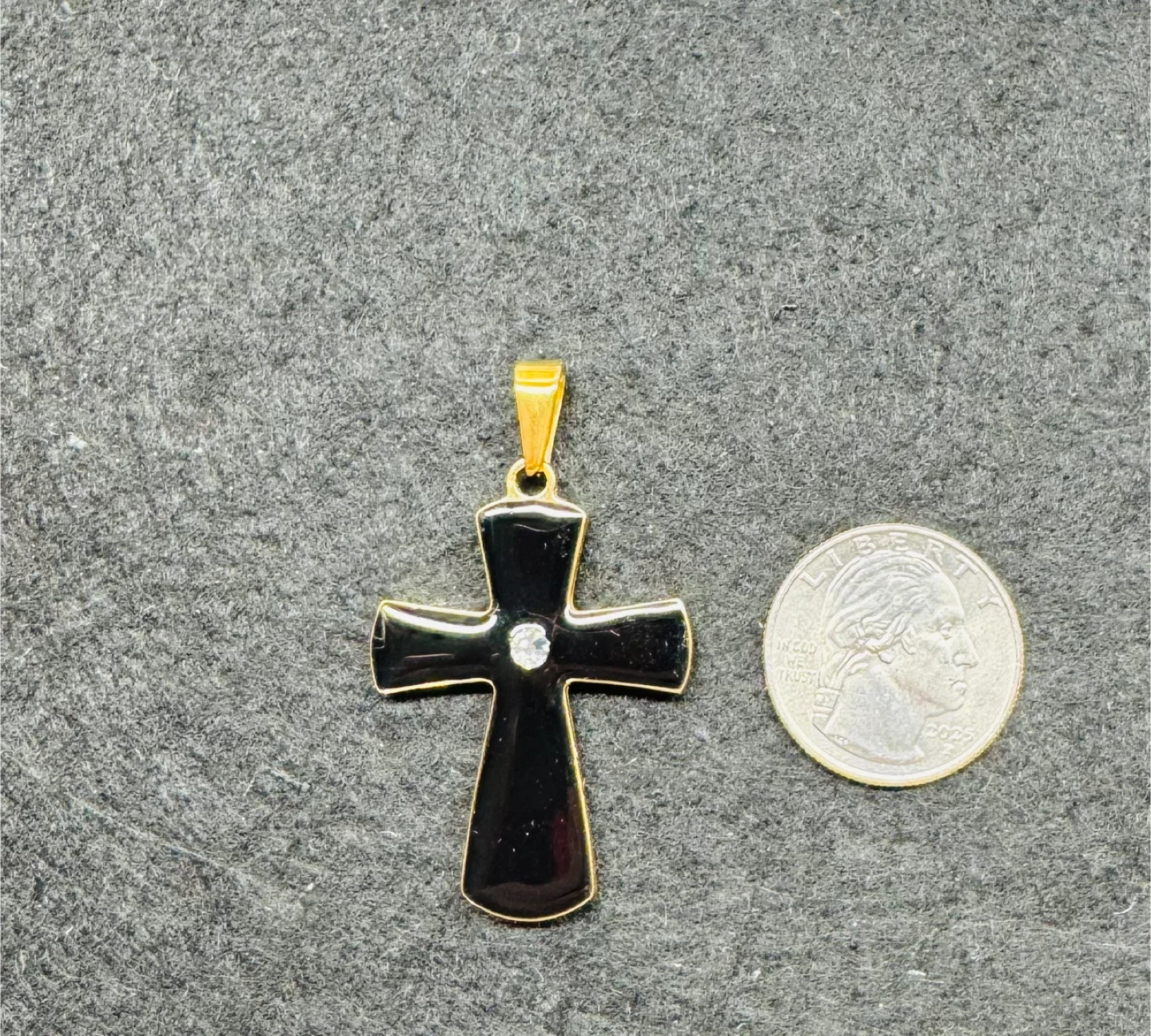 Two sided Enameled Cross with CZ Clear stone accent. It has a gold bail for hanging.