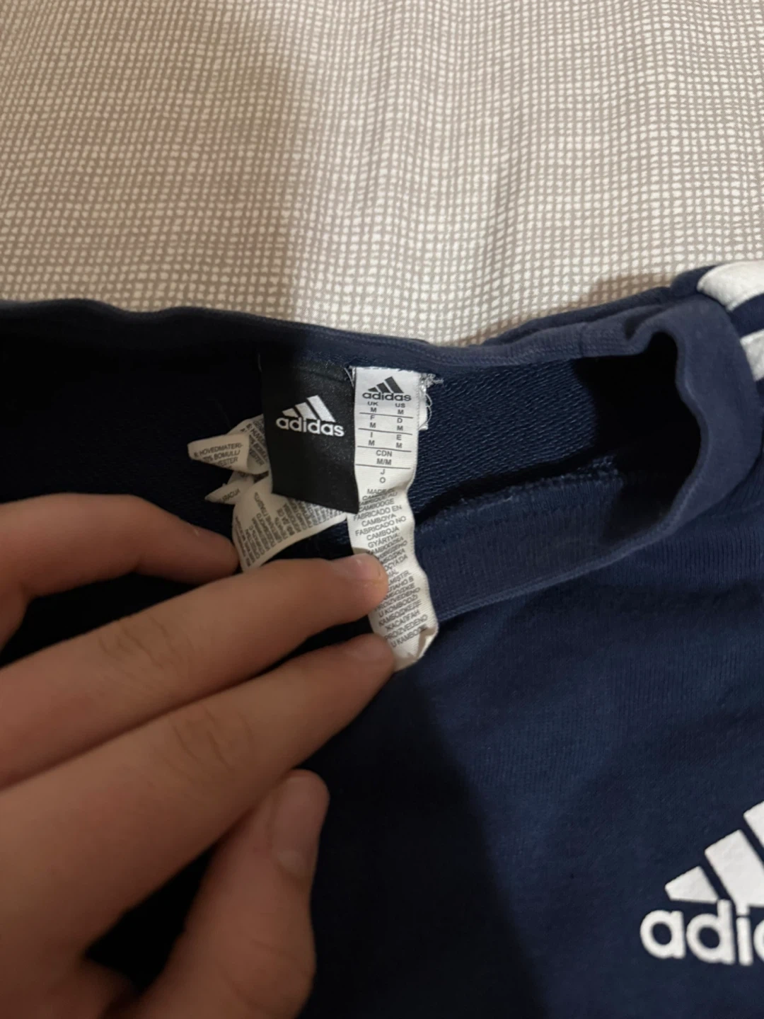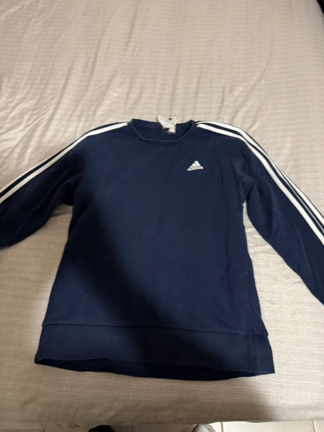 Navy blue Adidas crewneck sweatshirt with white stripes on the sleeves. It's a size medium, made from a cotton blend. Great for casual wear!