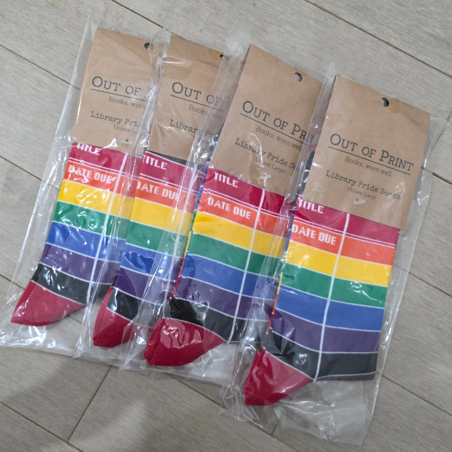 Set of 4 Out of Print Library Pride Socks. These socks are unisex and size large. They feature a rainbow stripe design with 'DATE DUE' printed on them.