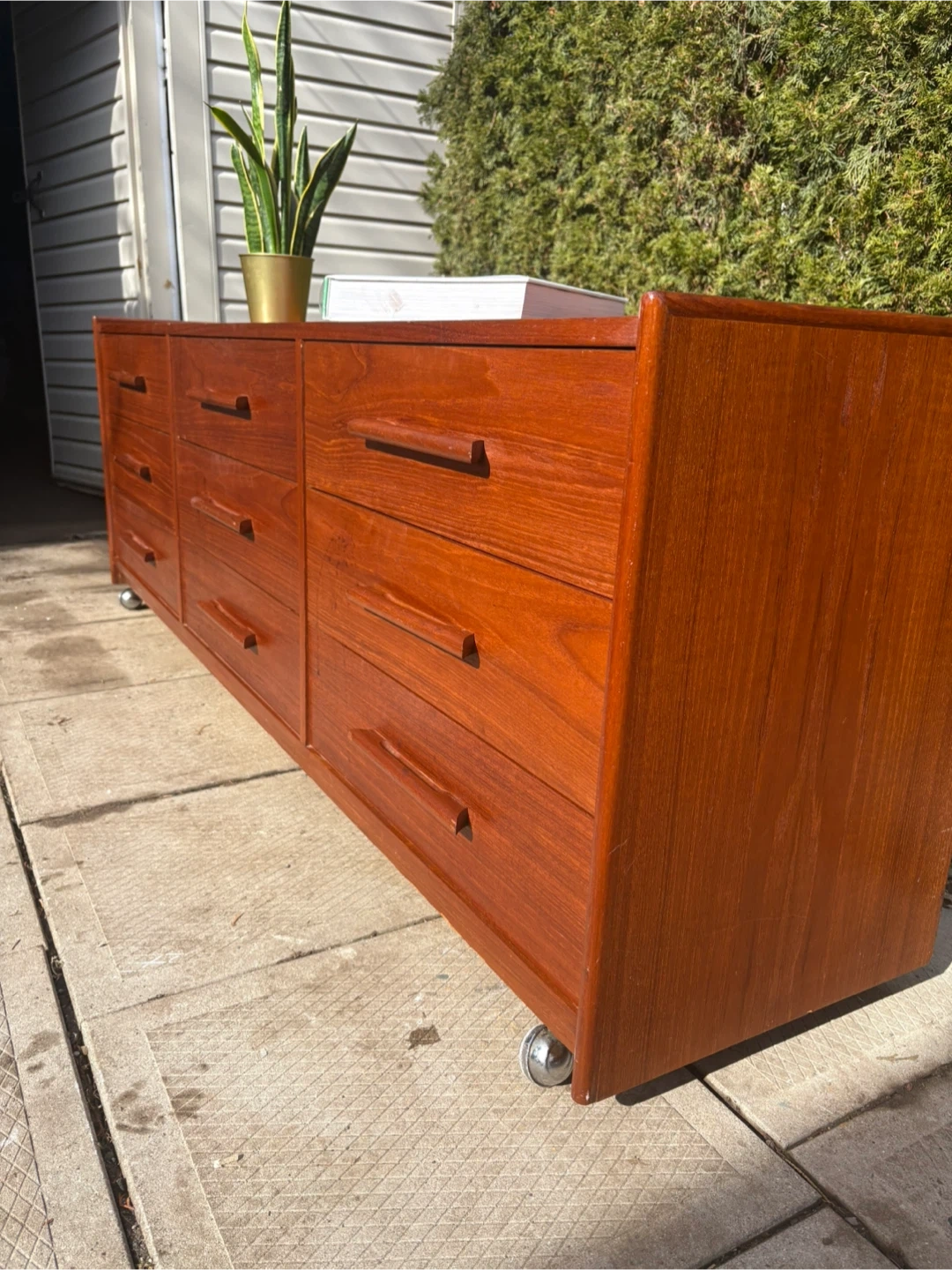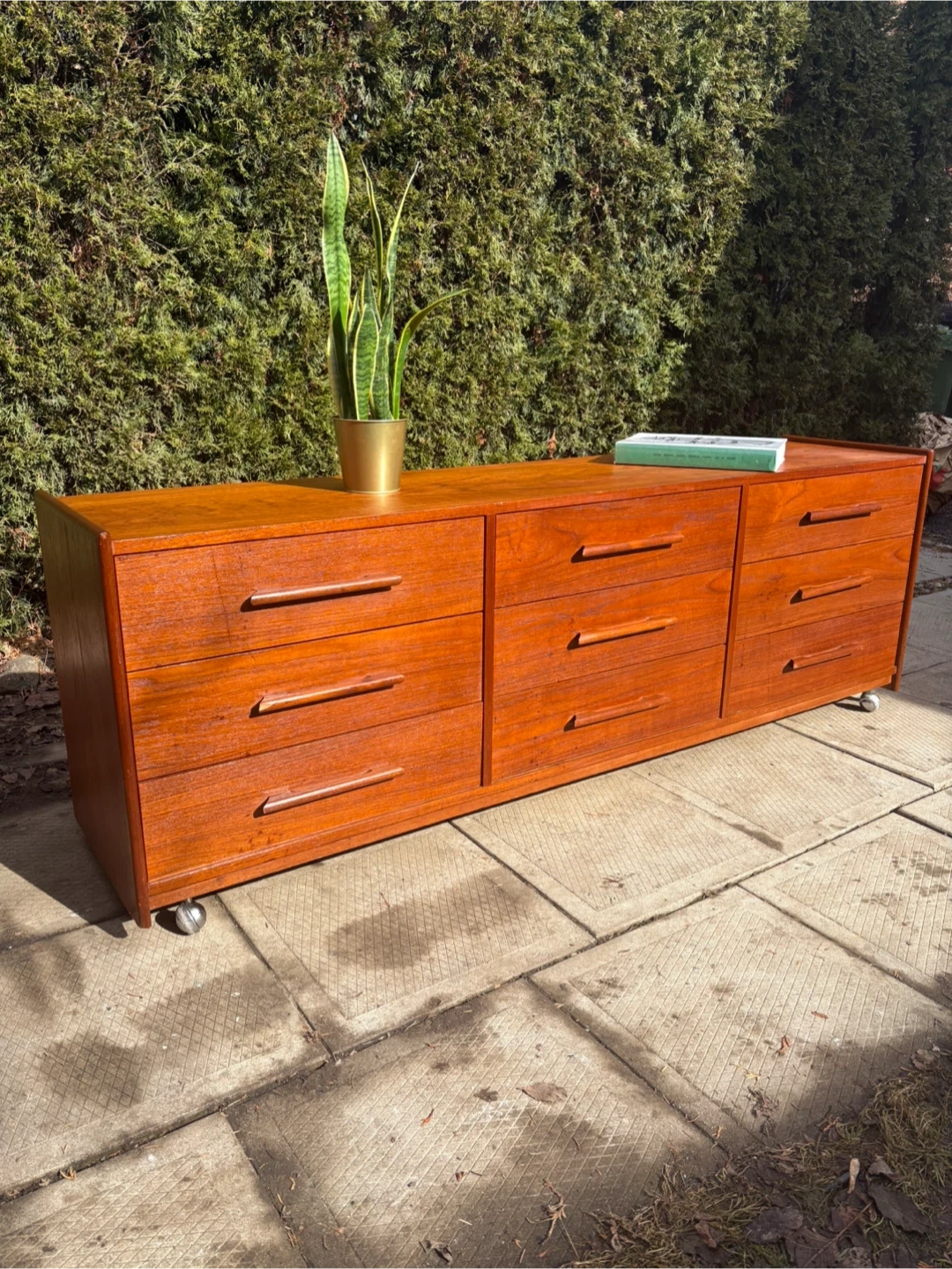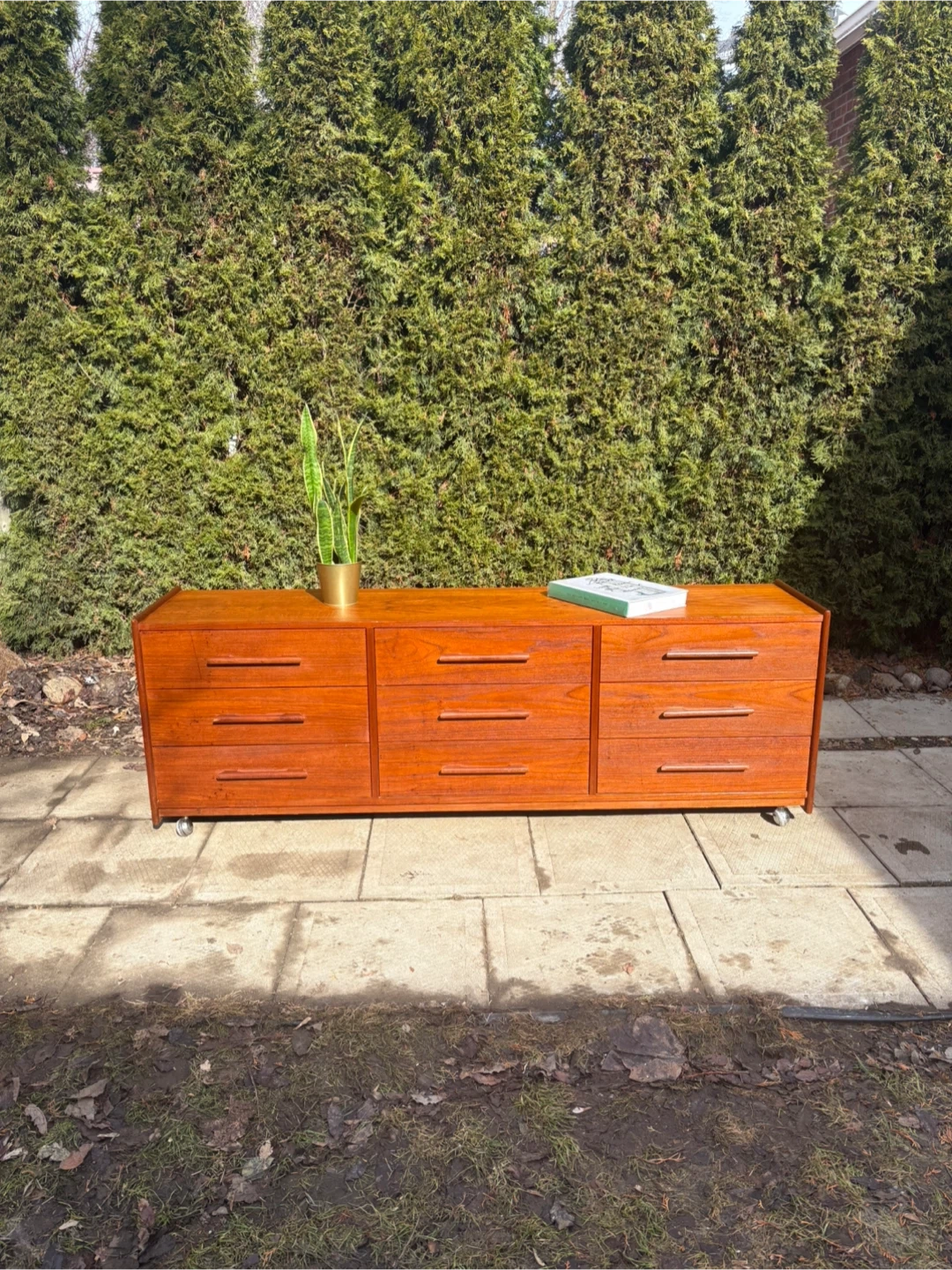 Mid century modern 9 drawer dresser in a warm wood finish with clean lines and sleek pulls. Plenty of storage with a low, wide profile that works well in a bedroom or living space. Currently sits on castors for easy movement, but they can be removed if you prefer it to sit directly on the floor.