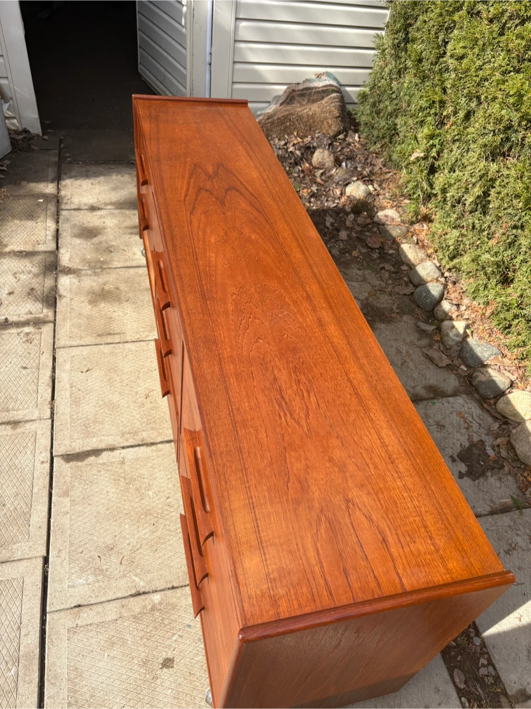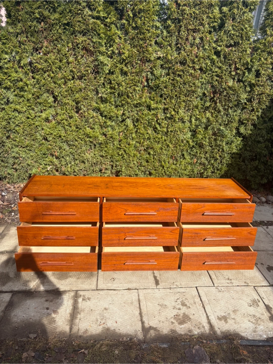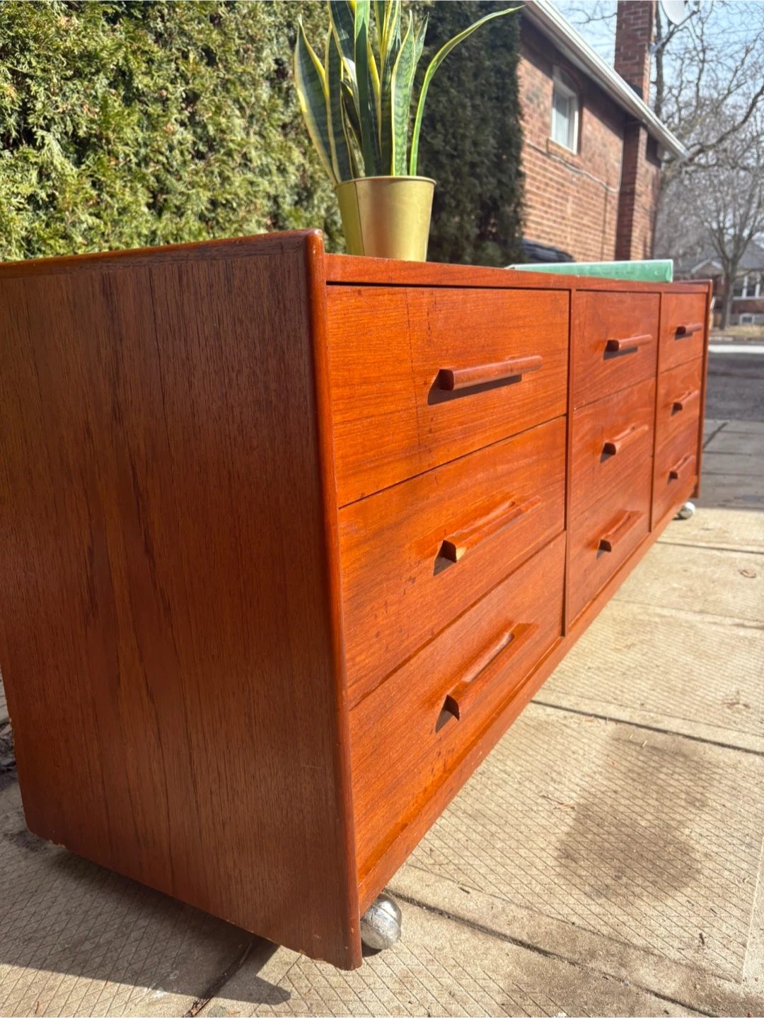 Mid century modern 9 drawer dresser in a warm wood finish with clean lines and sleek pulls. Plenty of storage with a low, wide profile that works well in a bedroom or living space. Currently sits on castors for easy movement, but they can be removed if you prefer it to sit directly on the floor.