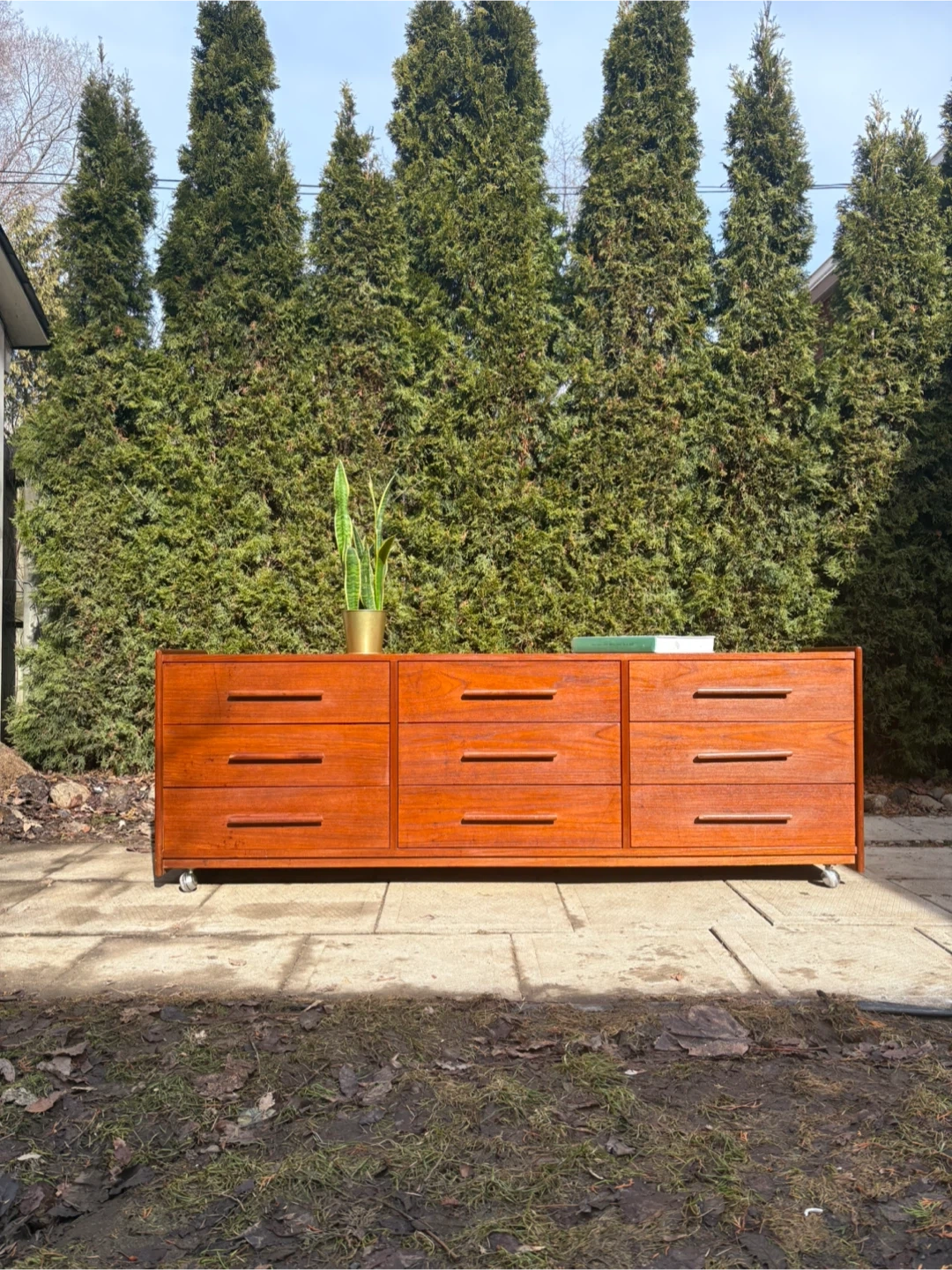 Mid century modern 9 drawer dresser in a warm wood finish with clean lines and sleek pulls. Plenty of storage with a low, wide profile that works well in a bedroom or living space. Currently sits on castors for easy movement, but they can be removed if you prefer it to sit directly on the floor.