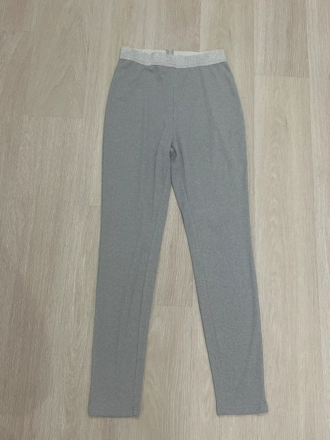 Grey leggings with a sparkly waistband. These leggings are made from a ribbed knit fabric. They're comfortable for everyday wear! Tried once to try on.