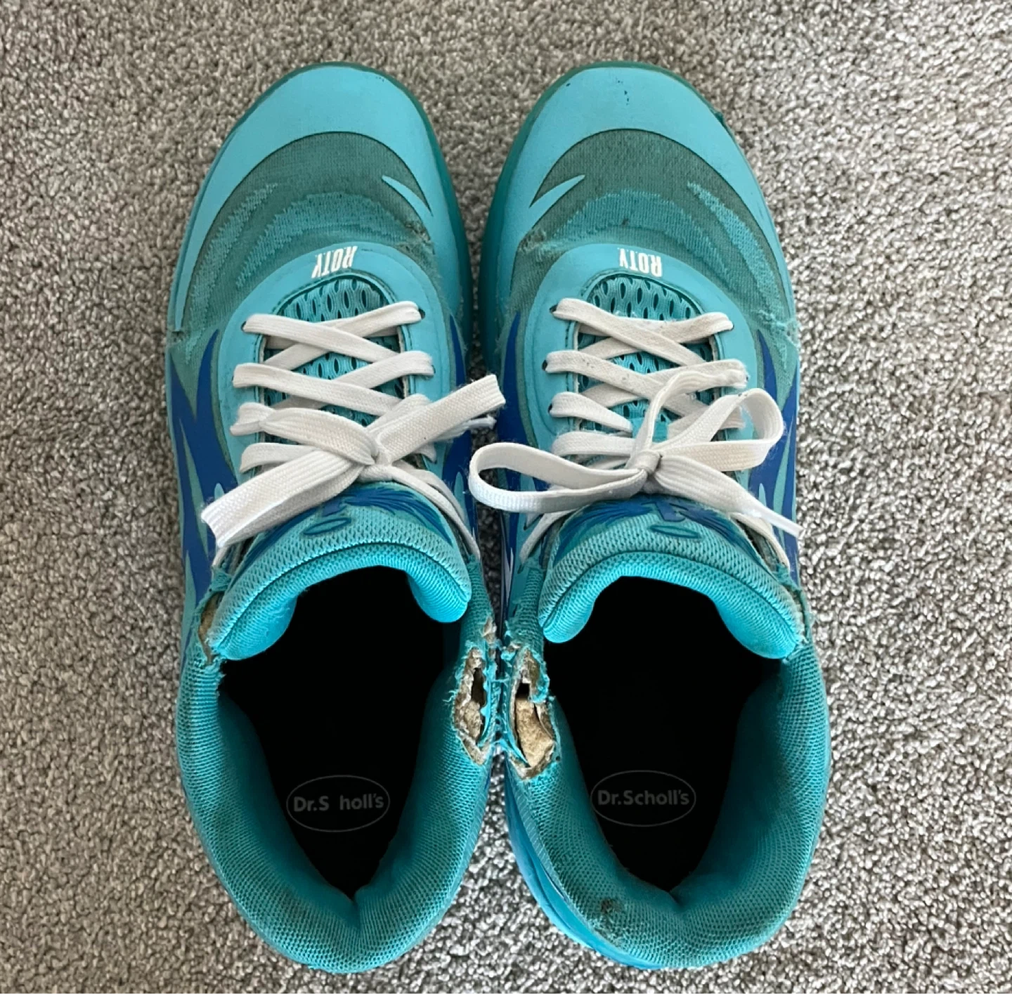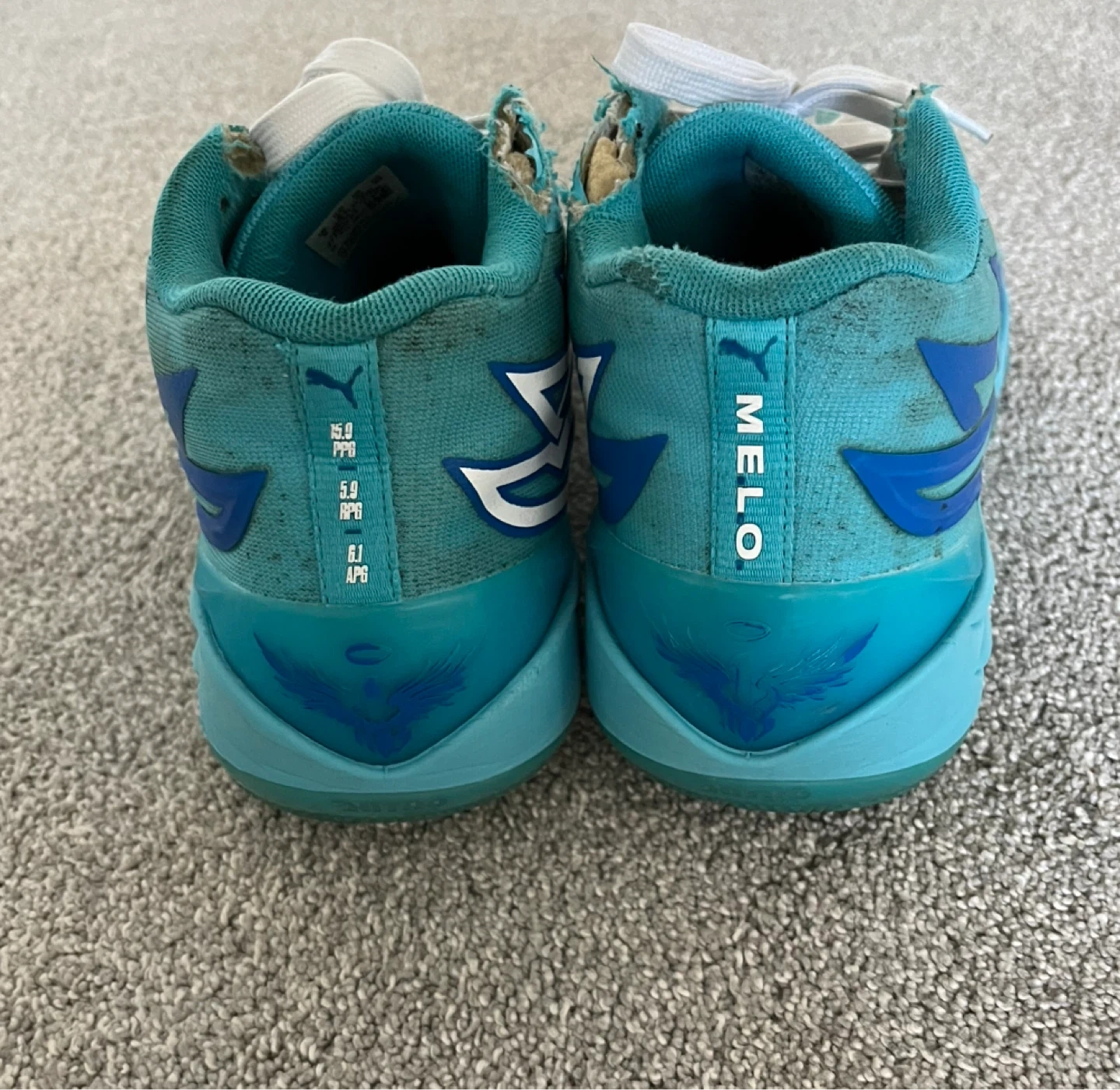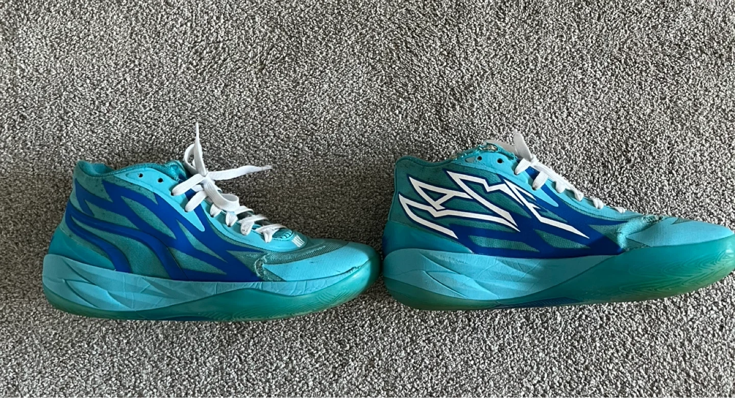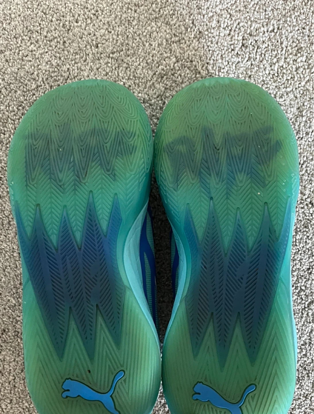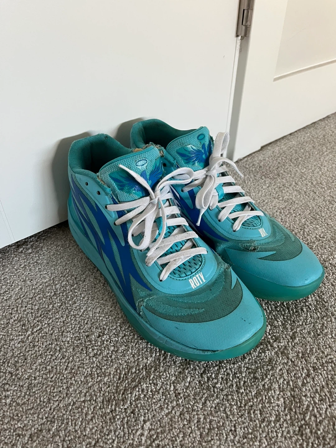 Puma MB.01 basketball shoes in a teal and blue colourway. Added insoles on top of the original. Really beat and used with white laces. Size 10 mens.