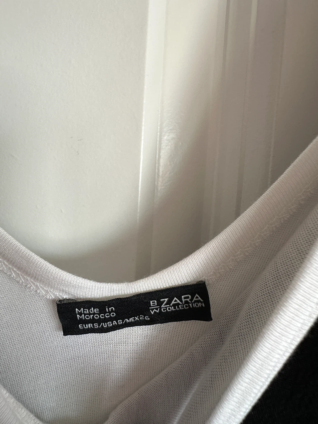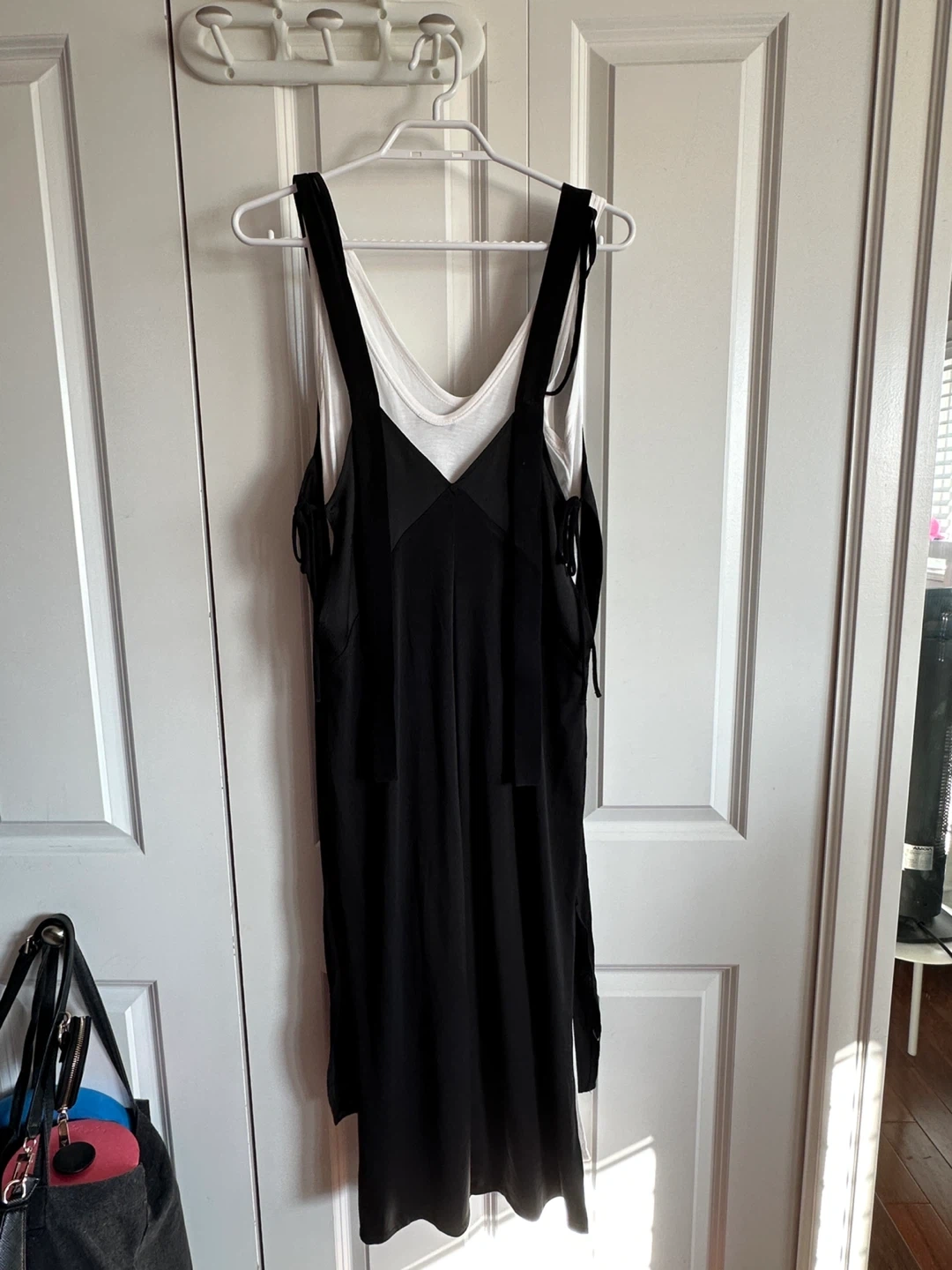 Zara slip dress with a V-neck and tie straps. Includes a white camisole. Black outer dress is made of a silky material. Made in Morocco.