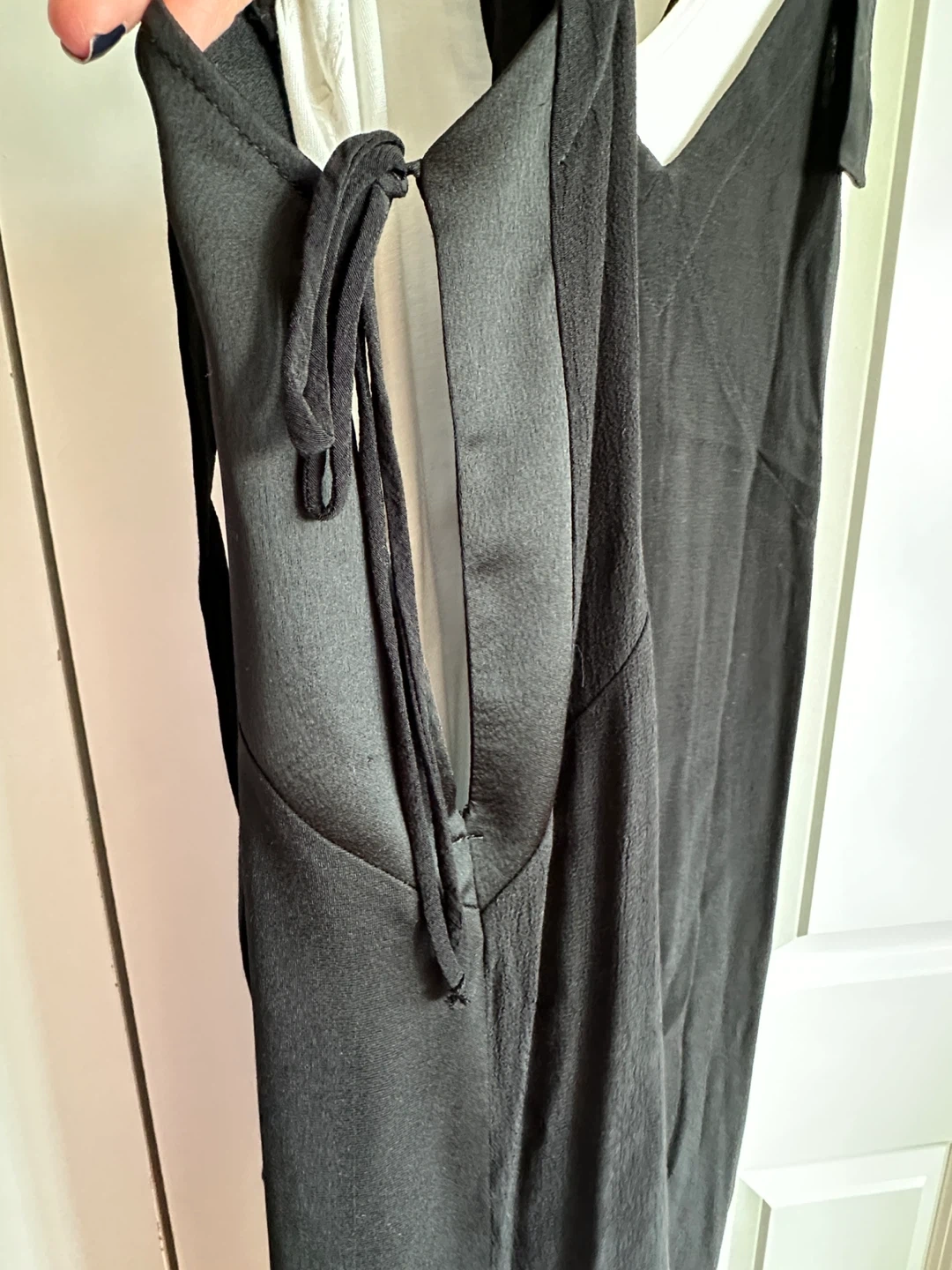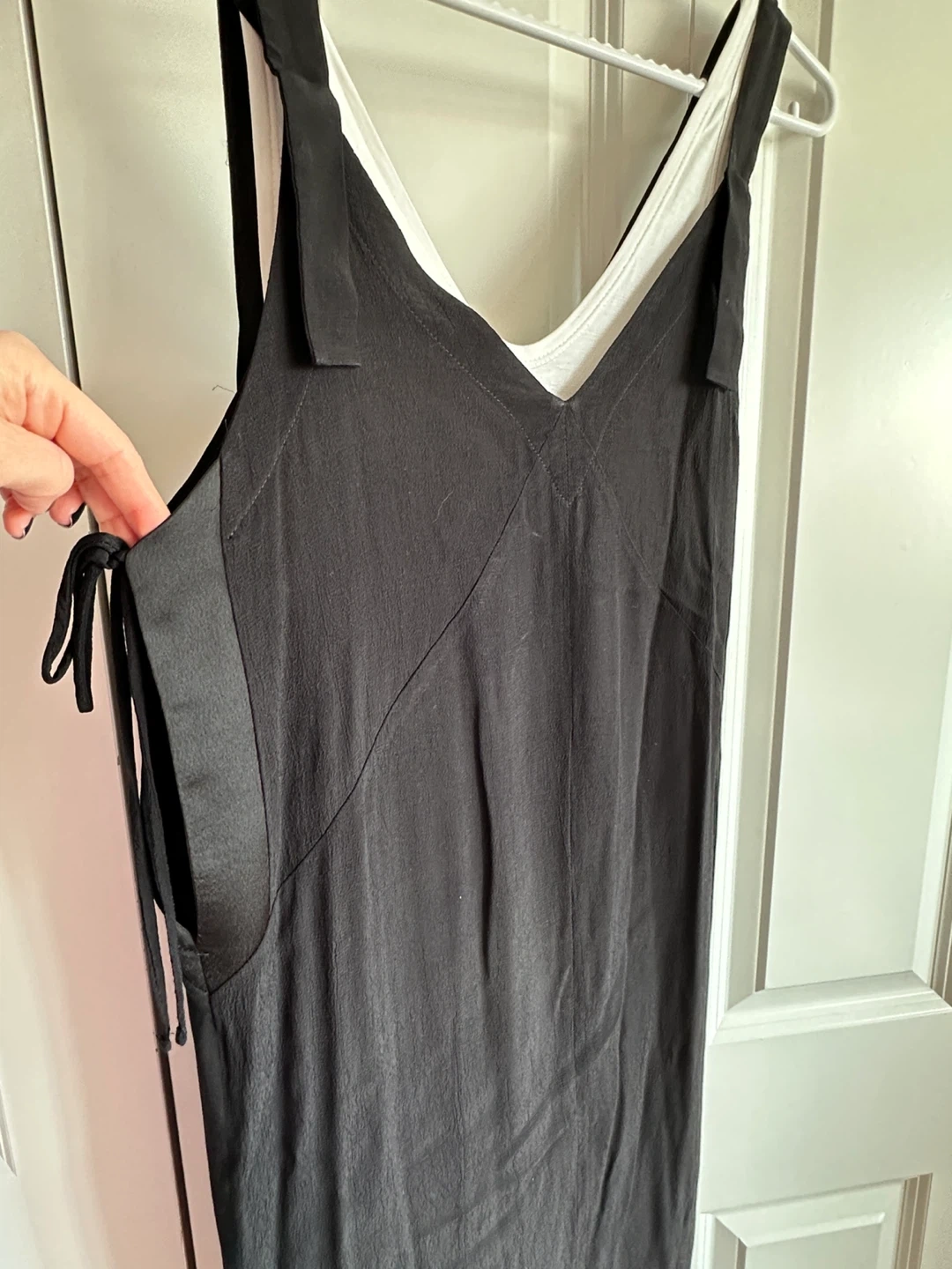 Zara slip dress with a V-neck and tie straps. Includes a white camisole. Black outer dress is made of a silky material. Made in Morocco.