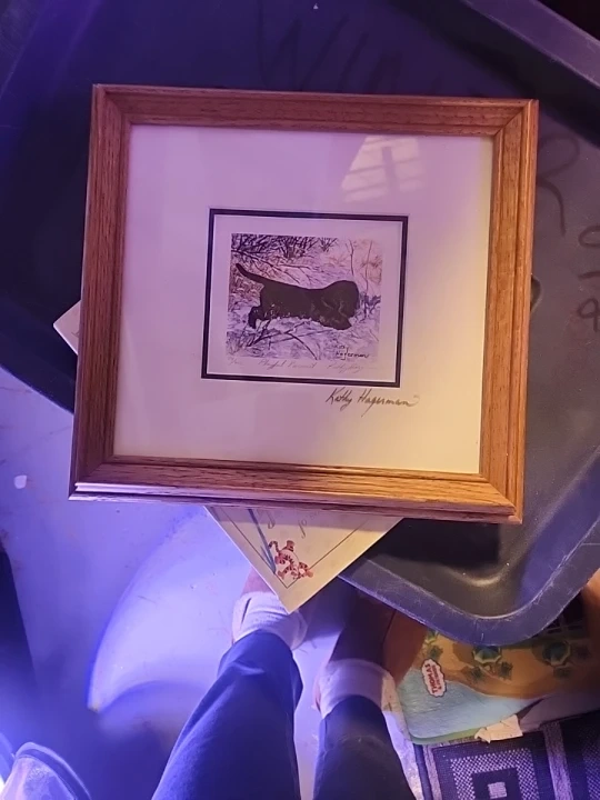 This is a limited edition art piece by Kathy Hagerman, titled 'Playful Pursuit'. It's print number 84 out of 600 impressions. The frame is included, adding a touch of rustic charm to this delightful depiction of a dog in the snow. It's a lovely piece to add to any art collection! If the ad is up, it's available