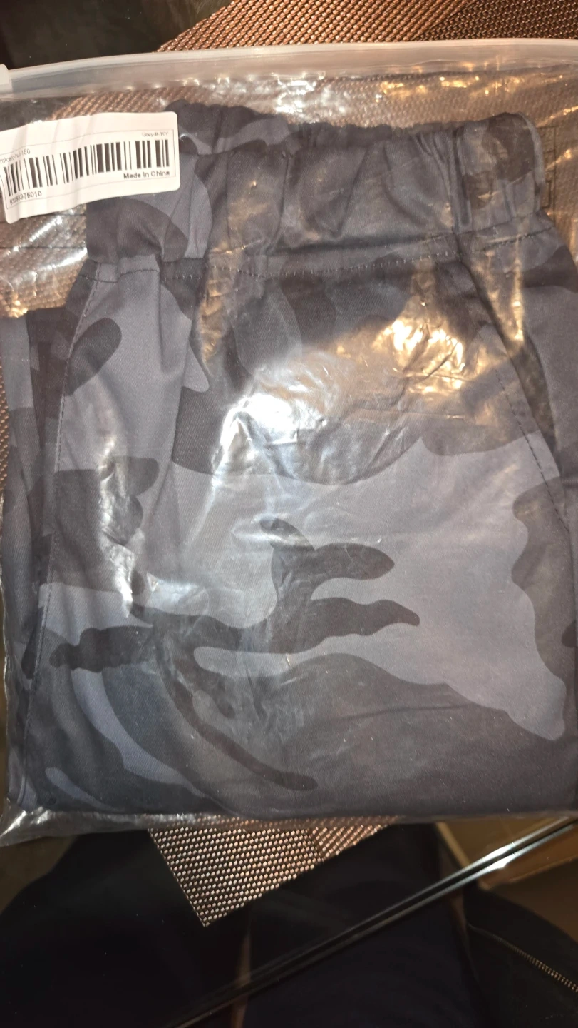 Kids' cargo pants in a grey camouflage pattern. Made of 100% polyester. These pants are size 9-10 years. Machine washable for easy care.