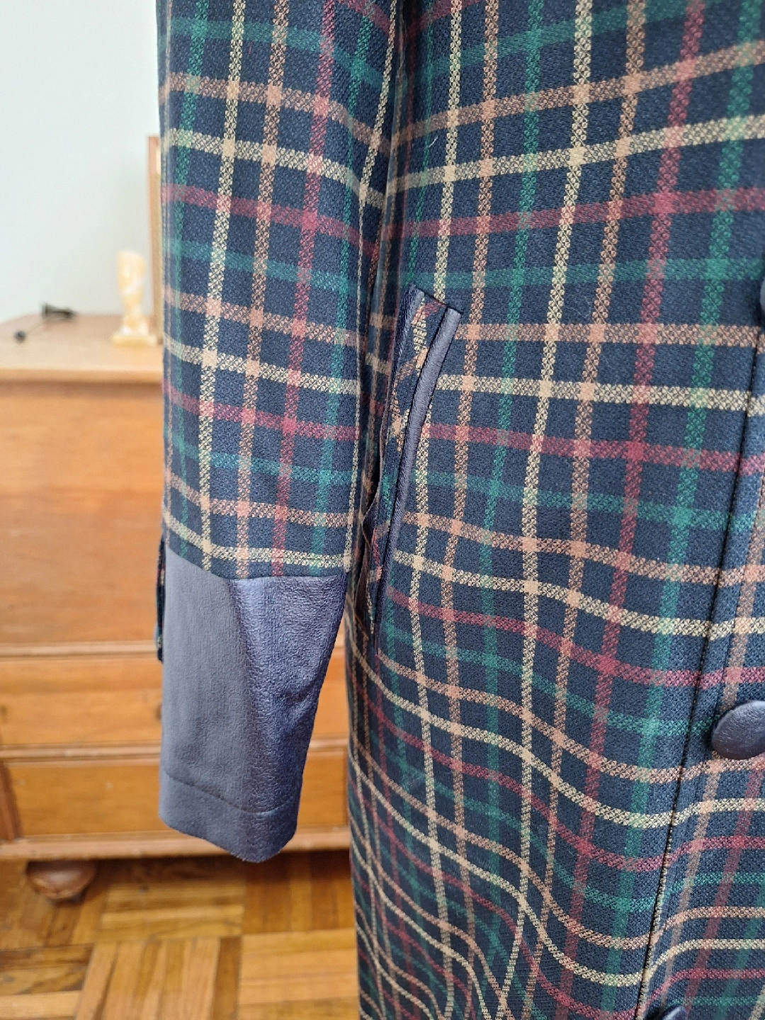 Here's a vintage coat with a unique plaid pattern! It features a wool blend material and distinctive leather-like accents on the collar, pockets, and cuffs. The coat has a double-breasted button closure and a long, elegant silhouette. Perfect for adding a touch of vintage charm to your wardrobe!